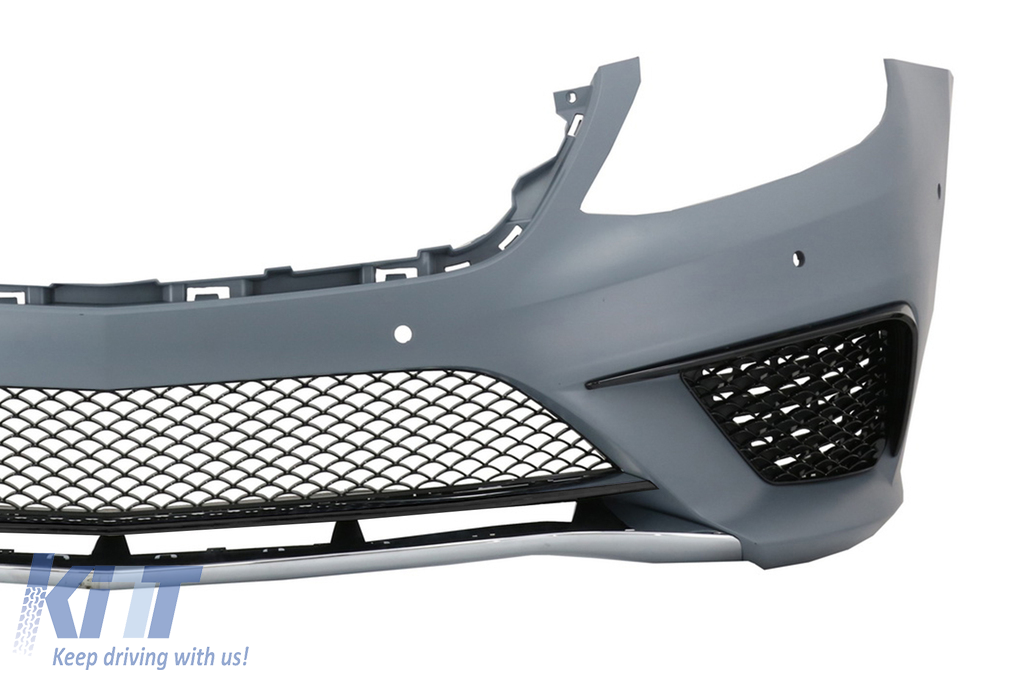 Front bumper equipped with black central-lower grille, black side grilles, PDC holders, tow hook cover and Brushed Aluminum front bumper extension spoiler.