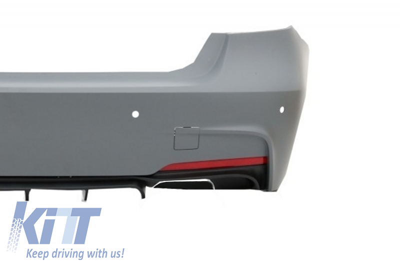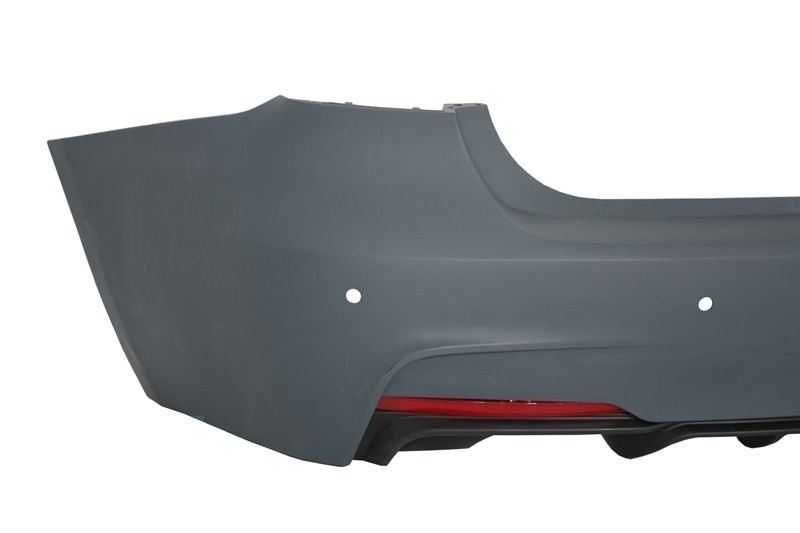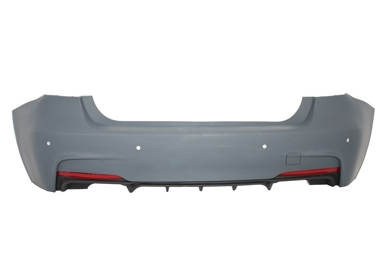 Rear bumper equipped with twin outlet for double exhaust and cover for the right outlet, red reflective accessories and parking sensor holders (PDC).