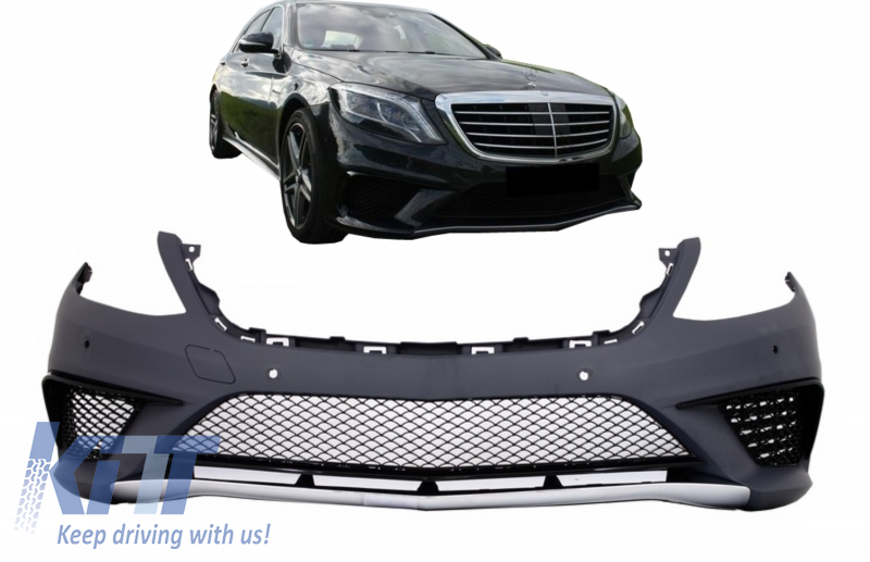 Front bumper equipped with black central-lower grille, black side grilles, black splitters, PDC holders, tow hook cover and brushed Aluminum front bumper extension spoiler