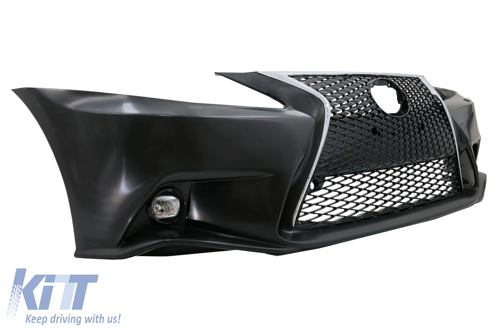 Front Bumper XE30 F-Sport Design equipped with Piano Black with chrome inserts central grille, mesh side grilles . For some models, it might require to exchange the original Lexus logo from the car with another one with a different size.