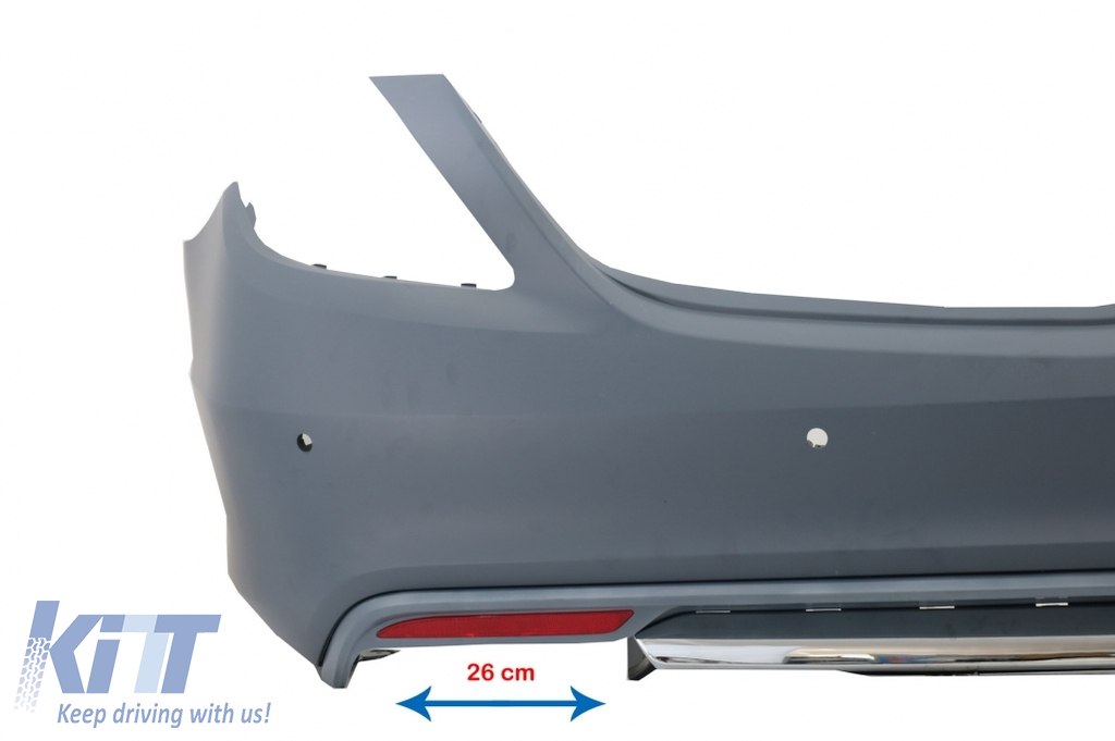Rear bumper equipped with double outlet exhaust, PDC Holders and brushed aluminum rear molding spoiler. Made of high quality PP (polypropylene) Material The body kit is prepared for painting process. (primed)