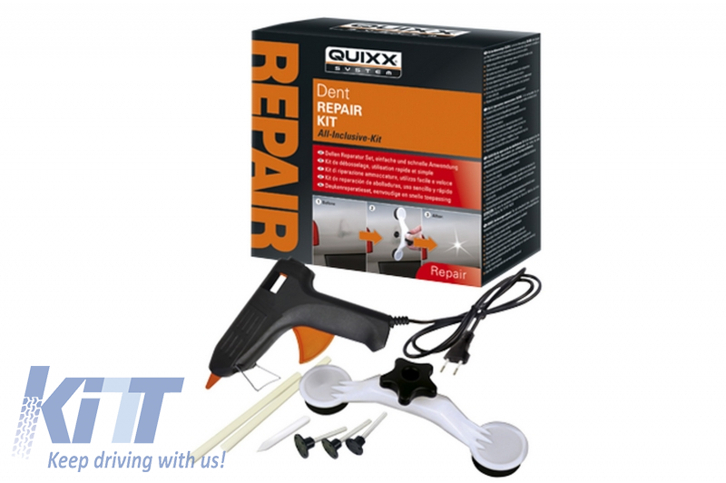 The QUIXX Dent Repair-Kit, developed by car body professionals, provides a quick and inexpensive remedy for dent problems. If the paint of your car has not been damaged by the dent it can be flattened also by nonprofessionals with the QUIXX Dent Repair-Kit.