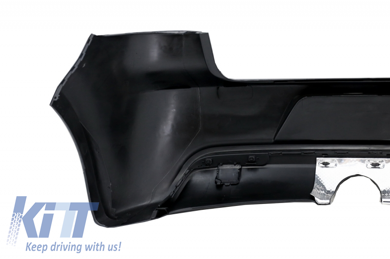 Rear bumper with diffuser and twin center exhaust mufflers, tow hook cover and red side reflectors.
