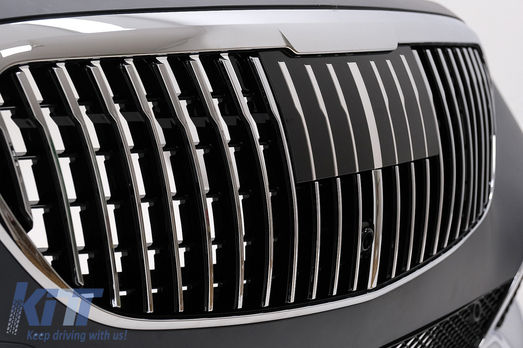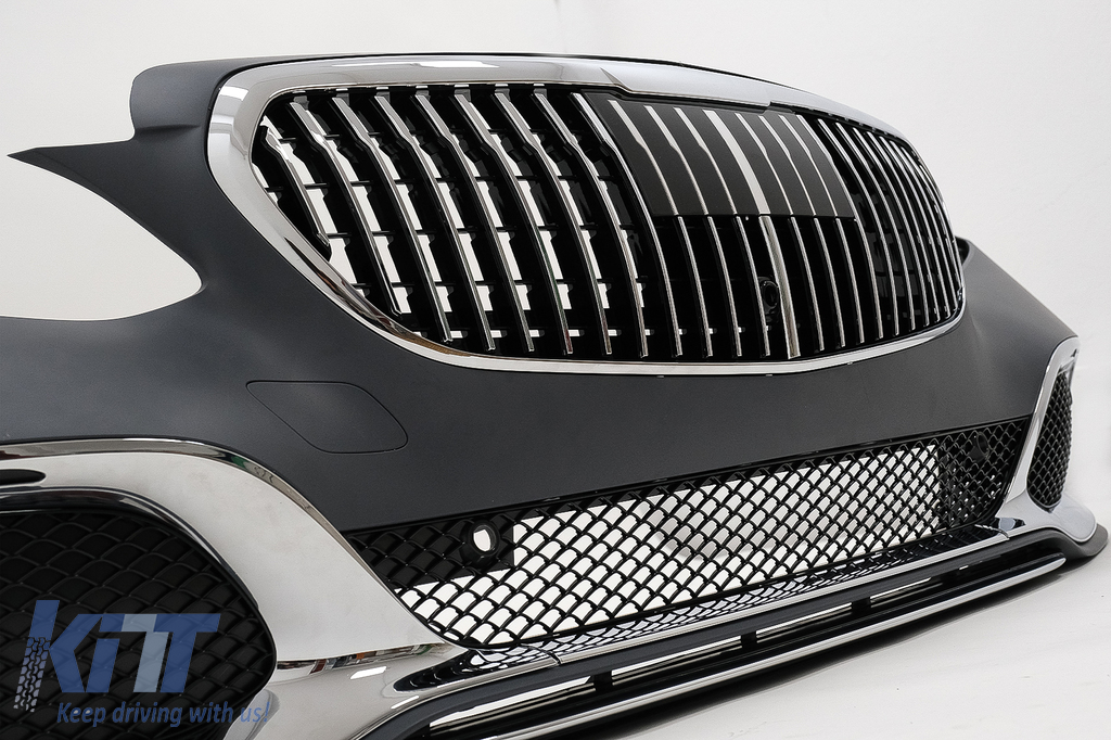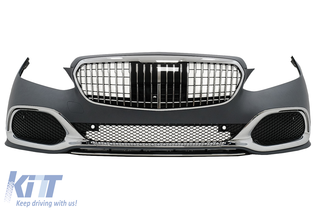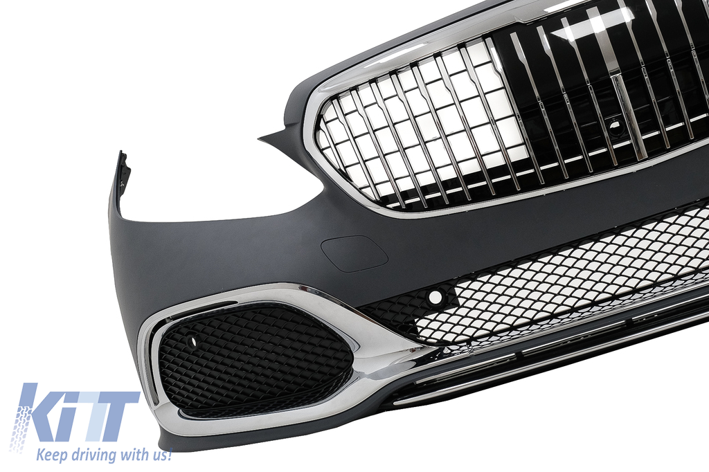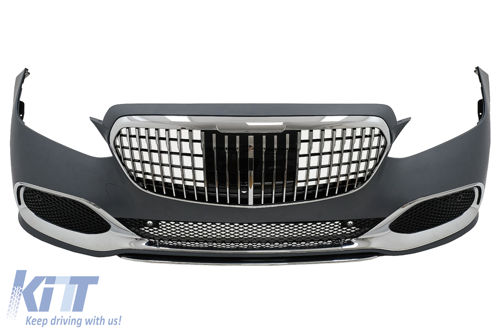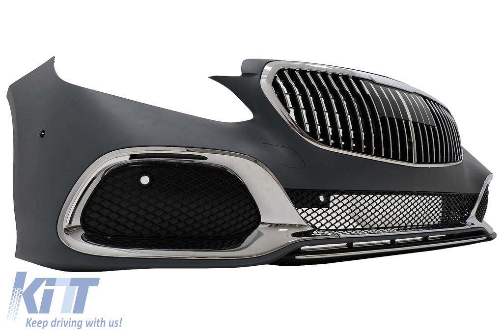 Equipped with central-lower grille, side grilles, camera holder, PDC holes and holders, front bumper moldings, and chromed front bumper accessories