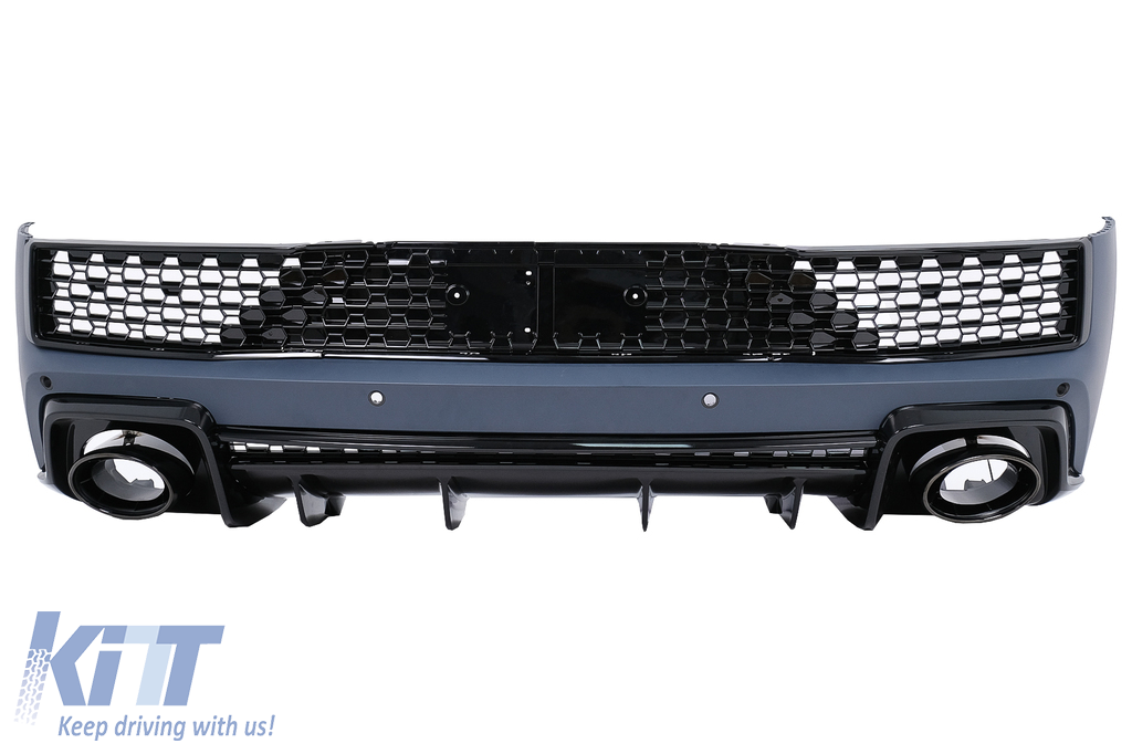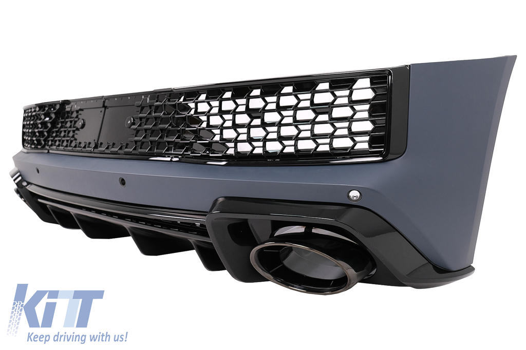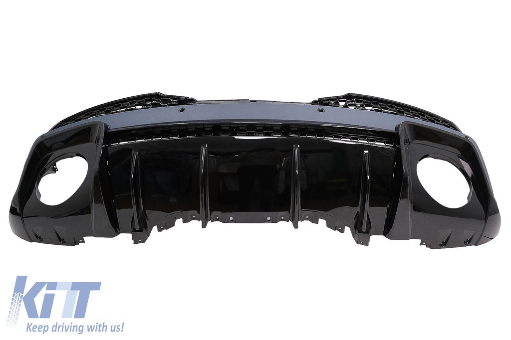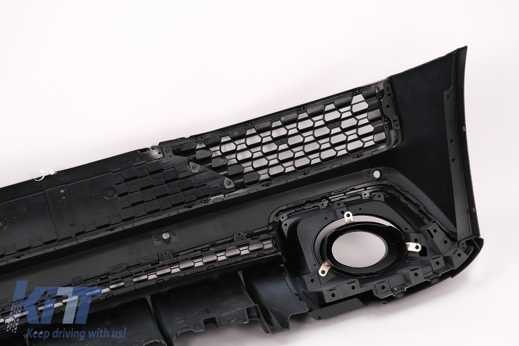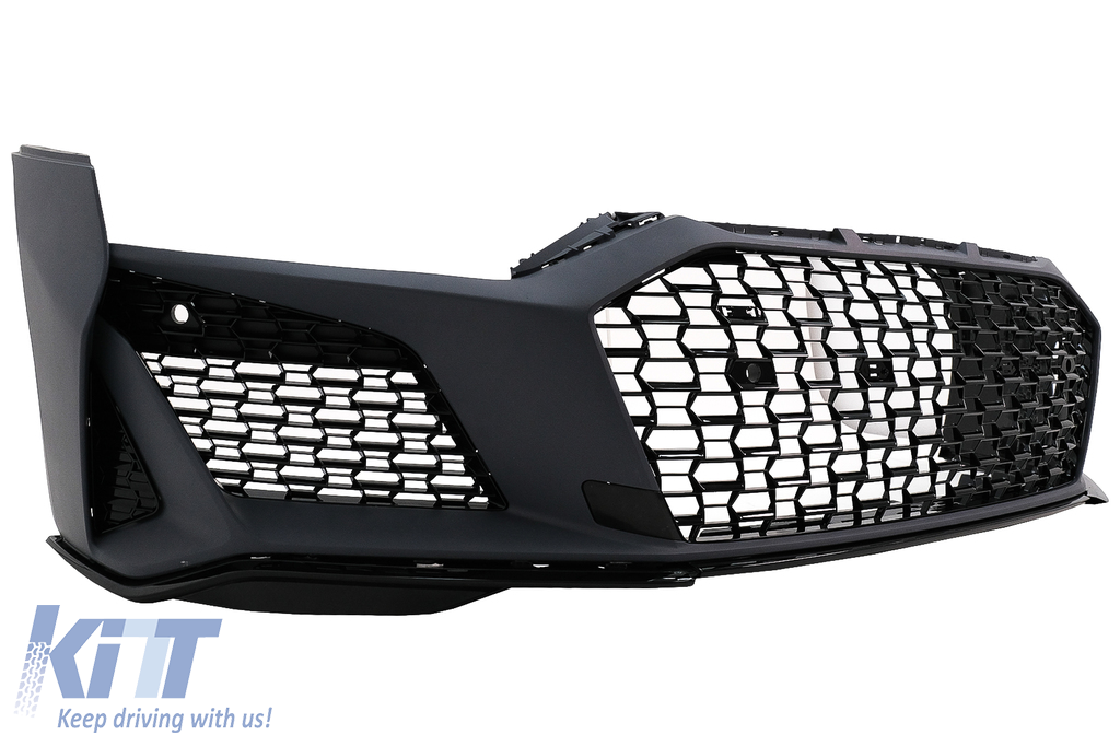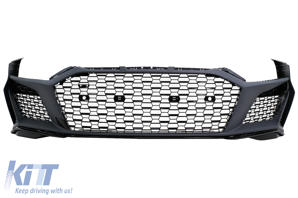 Equipped with central grille, side grilles, parking sensors (PDC) supports and holes, and front bumper lip.