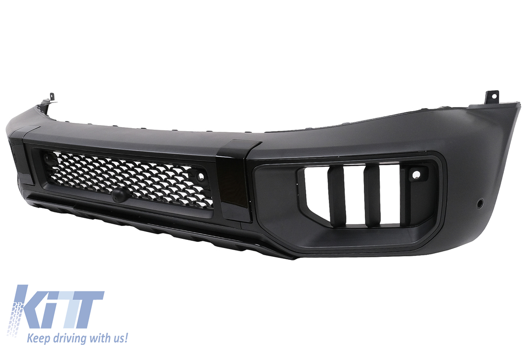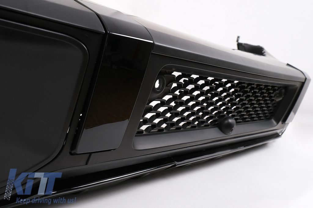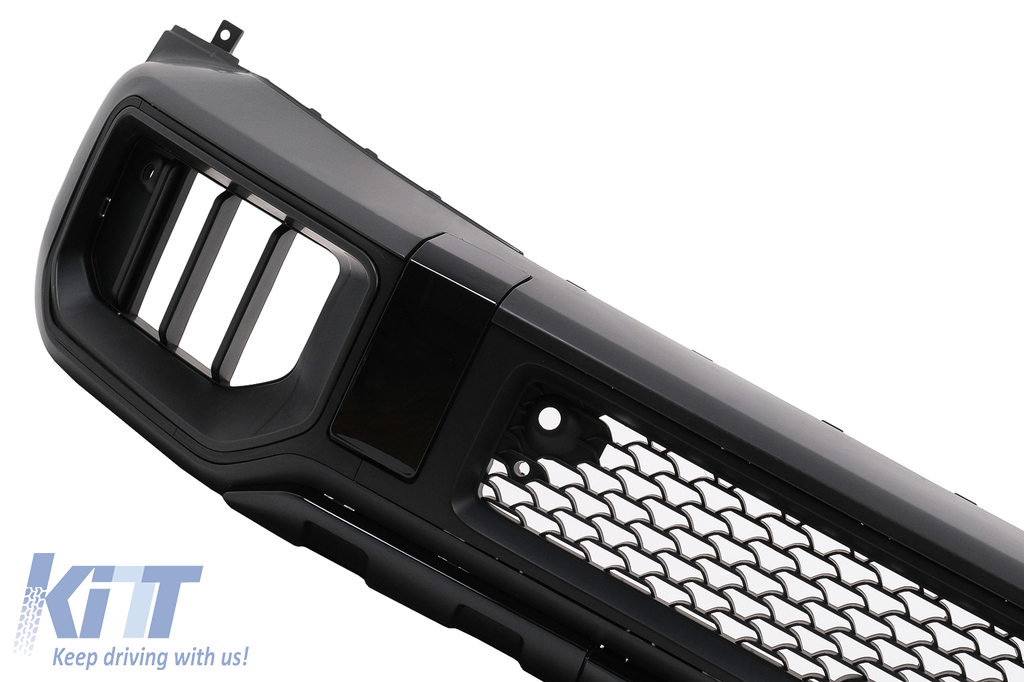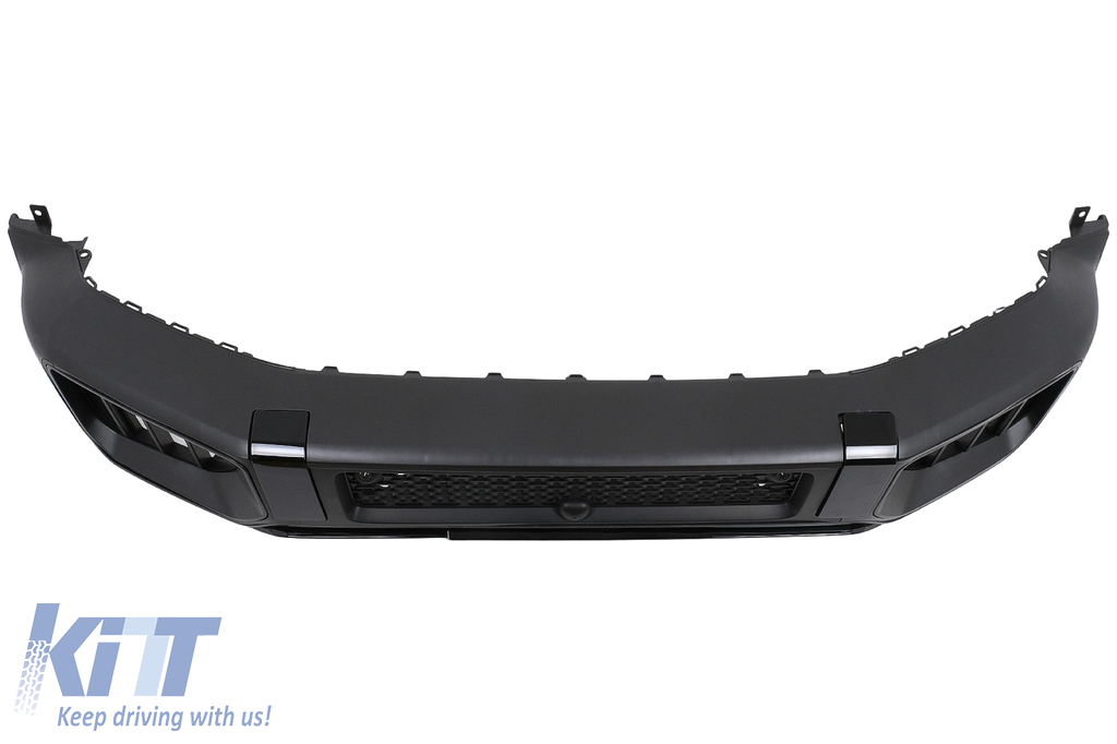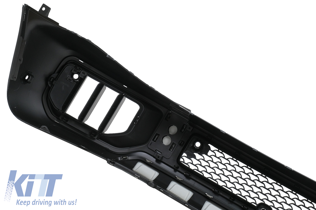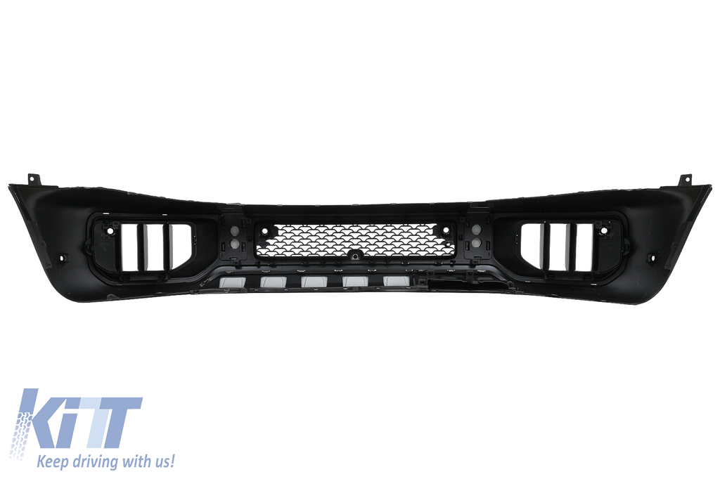 Front bumper is equipped with front bumper steel reinforcement, central grille, side grilles, ornaments, intercooler grilles, and PDC Support