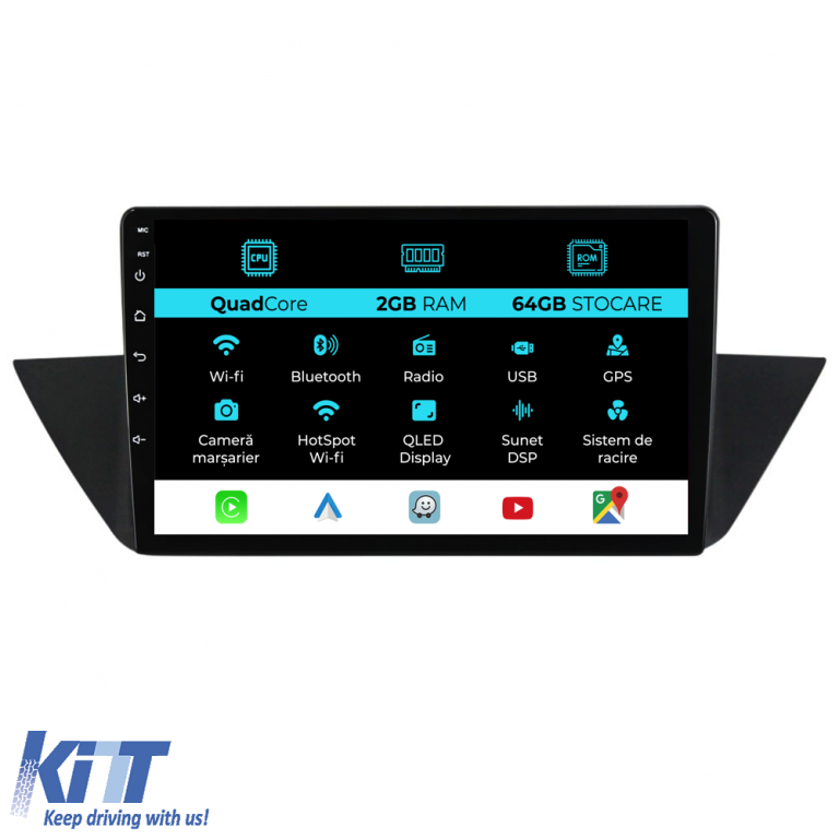 Operating system: Android 13 Processor: Quadcore RAM: 2GB Internal storage (ROM): 64GB Display size: 10 Inch Screen resolution: 1280x720p Bluetooth: Bluetooth for calls, phonebook download and music playback WiFi: Yes (Integrated) 4G SIM slot: No Network connectivity: Phone hotspot, external router, 3G or 4G dongle, CarPlay Android Auto Microphone: Built-in microphone, with possibility to connect external microphone Power supply: 12V Audio power: 4x45W DSP equalizer: Digital sound processor (DSP EQ) USB SD compatibility: Suitable for USB up to 128GB, SD support via USB adaptor Android app compatibility: Suitable for the majority of Android apps from Google Play CarPlay and Android Auto compatibility: Yes, suitable for iOS (CarPlay) and Android (Android Auto) Language support: Romanian, English, Hungarian, Spanish, Italian, German, etc. Screen type: Capacitive touchscreen, multi-touch, IPS Brightness settings: Yes RDS Radio: Yes RCA subwoofer output: Yes RCA video output: Yes, with the help of a USB adaptor RCA audio output: Yes GPS: Yes, (Google Maps, Waze, HereWeGo) Parking sensors: Yes (Pickup parking sensors with display where applicable) Steering wheel control: Yes (Pickup steering wheel controls with canbus or analog where applicable) DVR camera compatibility: Yes Reversing camera compatibility: Yes User manual: Yes Package contents: Android navigation Adapter frame Power cabling GPS antenna RCA connectors Wiring for reversing camera, 2 USB cables Canbus (only if applicable) Warranty certificate Fiscal invoice Navigation is suitable for the following car brands: BMW: X1 E84 (2009-2015)