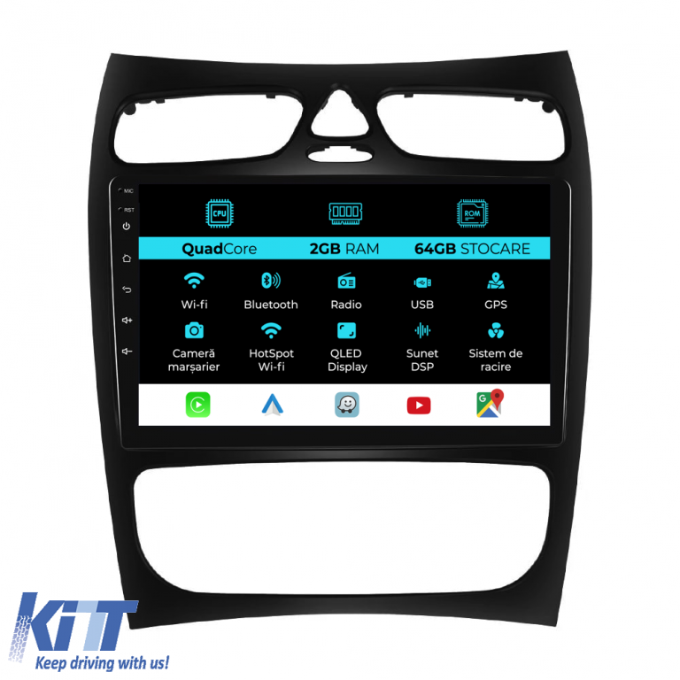 Operating system: Android 13 Processor: Quadcore RAM Memory: 2GB Internal storage (ROM): 64GB Display size: 9 Inch Screen resolution: 1280x720p Bluetooth: Bluetooth for calls, phonebook download, and music playback WiFi: Yes (Integrated) 4G SIM Slot: No Network connectivity: Phone hotspot, external router, 3G or 4G dongle, CarPlay Android Auto Microphone: Built-in microphone, with the possibility of connecting an external microphone Power supply: 12V Audio power: 4x45W DSP equalizer: Digital sound processor (DSP EQ) USB SD compatibility: Suitable for USB up to 128GB, SD support via USB adapter Android app compatibility: Suitable for most Android apps from Google Play CarPlay and Android Auto compatibility: Yes, suitable for iOS (CarPlay) and Android (Android Auto) Language support: Romanian, English, Hungarian, Spanish, Italian, German, etc. Screen type: Capacitive TouchScreen, multi-touch, IPS Brightness settings: Yes RDS Radio: Yes RCA subwoofer output: Yes RCA video output: Yes, using a USB adapter RCA audio output: Yes GPS: Yes, (Google Maps, Waze, HereWeGo) Parking sensors: Yes (Parking sensor acquisition with display where applicable) Steering wheel control: Yes (Steering wheel control acquisition with canbus or analog where applicable) DVR camera compatibility: Yes Reversing camera compatibility: Yes User manual: Yes Package content: Android navigation Adapter frame Power wiring GPS antenna RCA connectors Wiring for reversing camera, 2 USB cables Canbus (only if applicable) Warranty certificate Fiscal invoice Navigation is suitable for the following car brands: Mercedes Benz: C-Class W203 (2000 - 2005) CLK W209 (1998 - 2005)