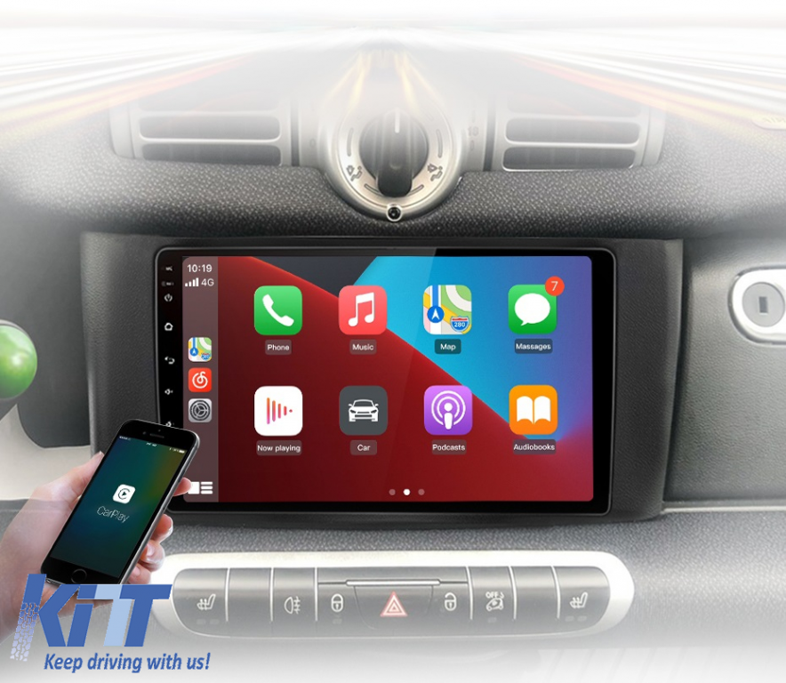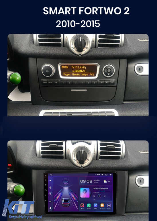 Operating system: Android 13 Processor: Octa-core 1.8Ghz RAM: 6GB Internal storage (ROM): 128GB Display size: 9 Inch Screen resolution: 1280x720p Bluetooth: Bluetooth for calls, phonebook download and music playback WiFi: Yes (Built-in) 4G SIM slot: Yes Network connectivity: 4G, phone hotspot, external router, 3G or 4G dongle, CarPlay Android Auto Microphone: Built-in microphone, with option to connect external microphone Power supply: 12V Audio power: 4x45W DSP equalizer: Digital sound processor (DSP EQ) USB SD compatibility: Suitable for USB up to 128GB, SD support via USB adapter Android application compatibility: Suitable for most Android applications from Google Play CarPlay and Android Auto compatibility: Yes, suitable for iOS (CarPlay) and Android (Android Auto) Language support: Romanian, English, Hungarian, Spanish, Italian, German, etc. Screen type: Capacitive touchscreen, multi-touch, IPS Brightness settings: Yes RDS radio: Yes RCA subwoofer output: Yes RCA video output: Yes, using a USB adapter RCA audio output: Yes GPS: Yes, (Google Maps, Waze, HereWeGo) Parking sensors: Yes (Integration of parking sensors with display where applicable) Steering wheel control: Yes (Integration of steering wheel controls with canbus or analog where applicable) DVR camera compatibility: Yes Rearview camera compatibility: Yes User manual: Yes Package contents: Android navigation Adapter frame Power wiring GPS antenna 4G antenna RCA connectors Wiring for rearview camera, 2 USB cables Canbus (only if applicable) Warranty certificate Invoice The navigation is suitable for the following car brands: Smart: For Two (2010-2015) For Four (2010-2015)