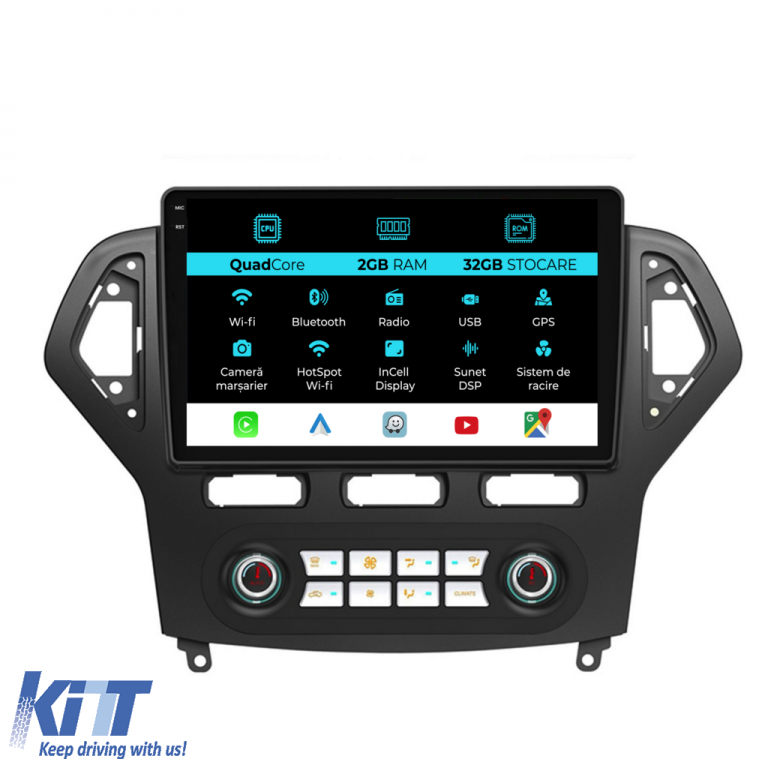 Operating system: Android 13 Processor: Quadcore RAM: 2GB Internal storage (ROM): 32GB Display size: 10 Inch Screen resolution: 1280x800p Bluetooth: Bluetooth for calls, phonebook download, and music playback WiFi: Yes (Integrated) 4G SIM Slot: No Network connectivity: Phone hotspot, external router, 3G or 4G dongle, CarPlay Android Auto Microphone: Integrated microphone, with the possibility of connecting an external microphone Power supply: 12V Audio power: 4x45W DSP equalizer: Digital sound processor (DSP EQ) USB SD compatibility: Suitable for USB up to 128GB, SD support via USB adapter Android app compatibility: Suitable for most Android apps from Google Play CarPlay and Android Auto compatibility: Yes, suitable for iOS (CarPlay) and Android (Android Auto) Language support: Romanian, English, Hungarian, Spanish, Italian, German, etc. Screen type: Capacitive touchscreen, multi-touch, IPS Brightness settings: Yes RDS radio: Yes RCA subwoofer output: Yes RCA video output: Yes, with the help of a USB adapter RCA audio output: Yes GPS: Yes (Google Maps, Waze, HereWeGo) Parking sensors: Yes (Parking sensor pickup with display where applicable) Steering wheel control: Yes (Steering wheel controls pickup with canbus or analog where applicable) DVR camera compatibility: Yes Reverse camera compatibility: Yes User manual: Yes Package contents: Android navigation Adapter frame Power wiring GPS antenna RCA connectors Wiring for reverse camera, 2 USB cables Canbus (only if applicable) Warranty certificate Invoice Navigation is suitable for the following car brands: FORD: Mondeo (2007-2014)
