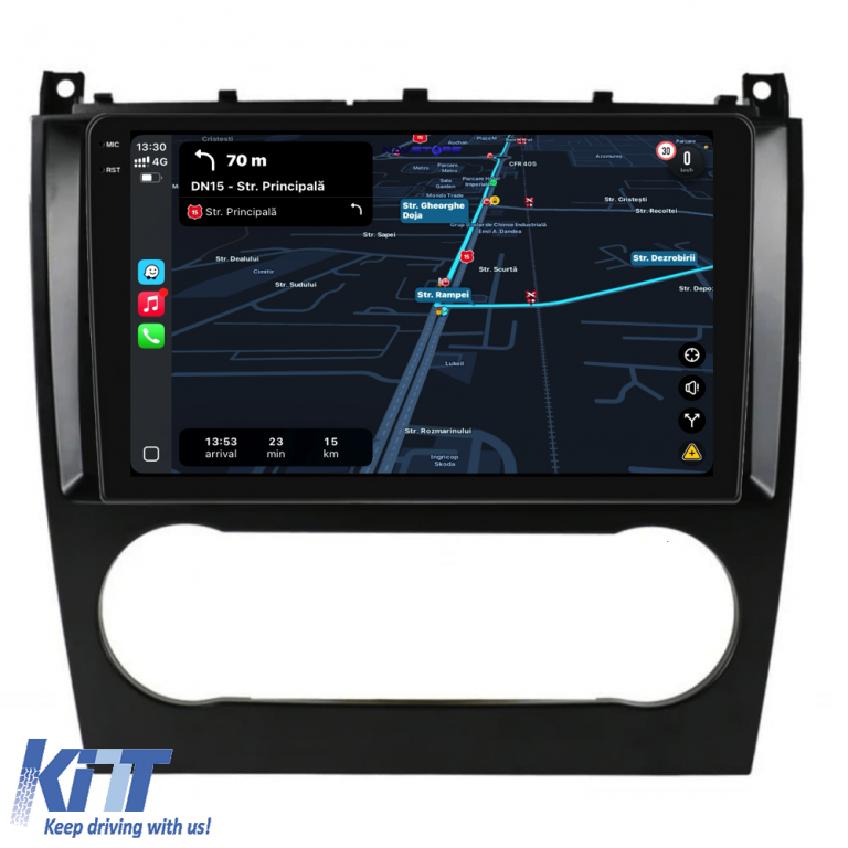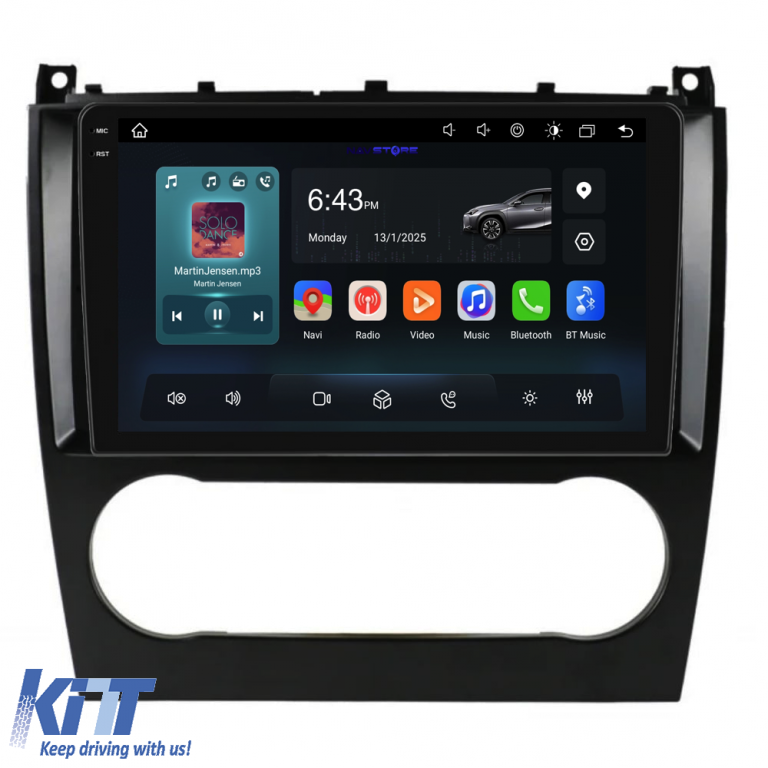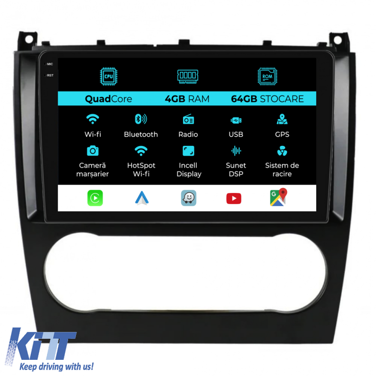 Operating system: Android 13 Processor: Quad-core 1.5Ghz RAM: 4GB Internal storage (ROM): 64GB Display size: 9 Inch Screen resolution: 1360x800p Bluetooth: Bluetooth for calls, phonebook download and music playback WiFi: Yes (Integrated) 4G SIM slot: No Network connectivity: Phone hotspot, external router, 3G or 4G dongle, CarPlay Android Auto Microphone: Built-in microphone, with the possibility of connecting an external microphone Power supply: 12V Audio power: 4x45W DSP equalizer: Digital sound processor (DSP EQ) USB SD compatibility: Suitable for USB up to 128GB, SD support via USB adapter Android app compatibility: Suitable for most Android apps from Google Play CarPlay and Android Auto compatibility: Yes, suitable for iOS (CarPlay) and Android (Android Auto) Language support: Romanian, English, Hungarian, Spanish, Italian, German, etc. Screen type: Capacitive TouchScreen, multi-touch, IPS Brightness settings: Yes RDS Radio: Yes Subwoofer RCA output: Yes Video RCA output: Yes, with the help of a USB adapter Audio RCA output: Yes GPS: Yes, (Google Maps, Waze, HereWeGo) Parking sensors: Yes (Takeover of parking sensors with display where applicable) Steering wheel control: Yes (Takeover of steering wheel commands with canbus or analog where applicable) DVR camera compatibility: Yes Reverse camera compatibility: Yes User manual: Yes Package contents: Android navigation Adapter frame Power wiring GPS antenna RCA connectors Wiring for reverse camera, 2 USB cables Canbus (only if applicable) Warranty certificate Fiscal invoice The navigation is suitable for the following car brands: Mercedes Benz: C-Class W203 (2005 - 2009) CLK W209 (2005 - 2009)