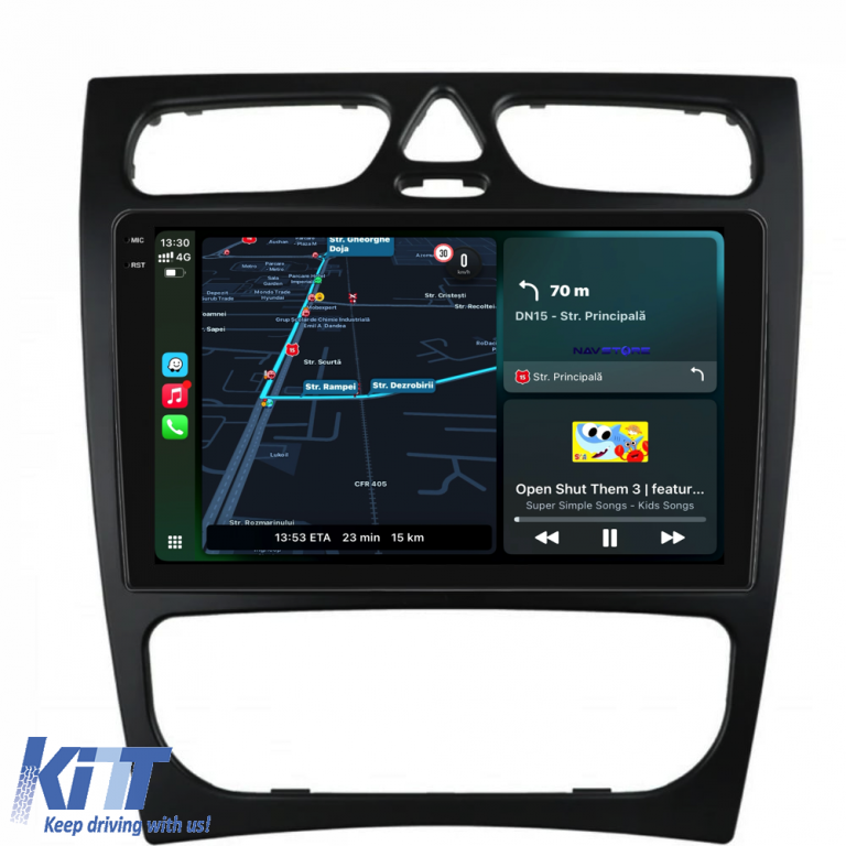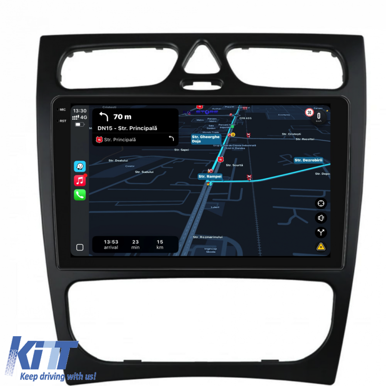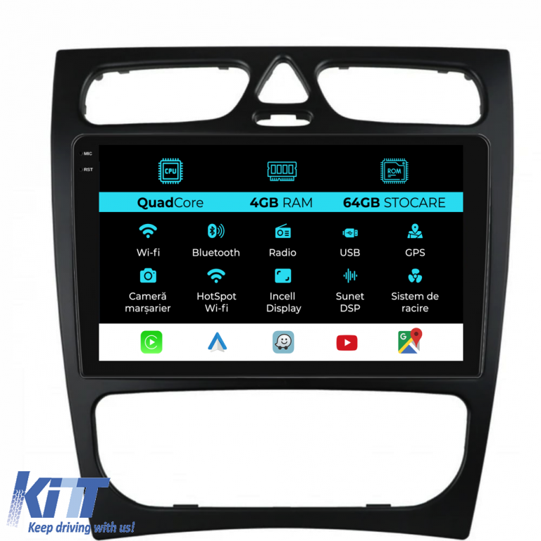 Operating System: Android 13 Processor: Quad-core 1.5Ghz RAM Memory: 4GB Internal Storage (ROM): 64GB Display Size: 9 Inch Screen Resolution: 1360x800p Bluetooth: Bluetooth for calls, phonebook download, and music playback WiFi: Yes (Integrated) 4G Sim Slot: No Network Connectivity: Phone hotspot, external router, 3G or 4G dongle, CarPlay Android Auto Microphone: Integrated microphone, with the possibility of connecting an external microphone Power Supply: 12V Audio Power: 4x45W DSP Equalizer: Digital sound processor (DSP EQ) USB SD Compatibility: Suitable for USB up to 128GB, supports SD via USB adapter Android App Compatibility: Suitable for most Android apps from Google Play CarPlay and Android Auto Compatibility: Yes, suitable for iOS (CarPlay) and Android (Android Auto) Language Support: Romanian, English, Hungarian, Spanish, Italian, German, etc. Screen Type: Capacitive TouchScreen, multi-touch, IPS Brightness Settings: Yes RDS Radio: Yes RCA Subwoofer Output: Yes RCA Video Output: Yes, with the help of a USB adapter RCA Audio Output: Yes GPS: Yes, (Google Maps, Waze, HereWeGo) Parking Sensors: Yes (Integration of parking sensors with display where applicable) Steering Wheel Control: Yes (Integration of steering wheel controls with canbus or analog where applicable) DVR Camera Compatibility: Yes Reversing Camera Compatibility: Yes User Manual: Yes Package Contents: Android Navigation Adapter Frame Power Wiring GPS Antenna RCA Connectors Wiring for reversing camera, 2 USB cables Canbus (only if applicable) Warranty Certificate Invoice The navigation is suitable for the following car brands: Mercedes Benz: C-Class W203 (2000 - 2005) CLK W209 (1998 - 2005)