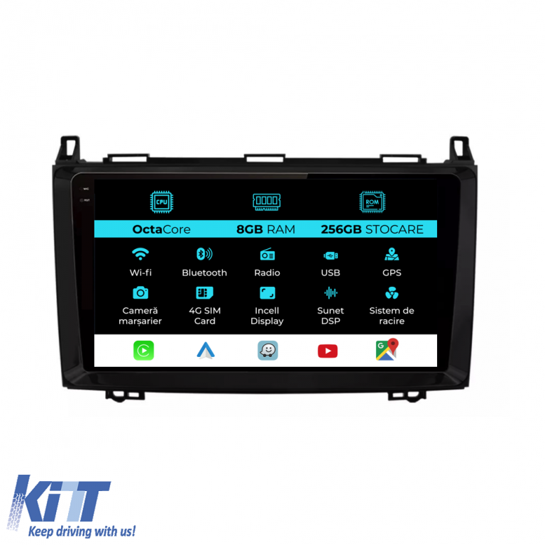Operating system: Android 13 Processor: Octa-core 1.8Ghz RAM memory: 8GB Internal storage (ROM): 256GB Display size: 9 Inch Screen resolution: 1360x8000p Bluetooth: Bluetooth for calls, phonebook download, and music playback WiFi: Yes (Integrated) 4G SIM slot: Yes Network connectivity: 4G, phone hotspot, external router, 3G or 4G dongle, CarPlay Android Auto Microphone: Integrated microphone, with option to connect external microphone Power supply: 12V Audio power: 4x45W DSP equalizer: Digital sound processor (DSP EQ) USB SD compatibility: Suitable for USB up to 128GB, SD support via USB adapter Android application compatibility: Suitable for most Android applications from Google Play CarPlay and Android Auto compatibility: Yes, suitable for iOS (CarPlay) and Android (Android Auto) Language support: Romanian, English, Hungarian, Spanish, Italian, German, etc. Screen type: Capacitive TouchScreen, multi-touch, IPS Brightness settings: Yes RDS radio: Yes RCA subwoofer output: Yes RCA video output: Yes, with the help of a USB adapter RCA audio output: Yes GPS: Yes, (Google Maps, Waze, HereWeGo) Parking sensors: Yes (Integration of parking sensors with display where applicable) Steering wheel control: Yes (Integration of steering wheel commands via canbus or analog where applicable) DVR camera compatibility: Yes Reversing camera compatibility: Yes User manual: Yes Package contents: Android Navigation Adapter frame Power cable GPS antenna 4G antenna RCA connectors Wiring for reversing camera, 2 USB cables Canbus (only if applicable) Warranty certificate Fiscal invoice Navigation is suitable for the following car brands: Mercedes Benz: Sprinter (2006-2012) A-Class (2004 - 2012) B-Class (2005 - 2011) Viano (2006-2012) Vito W639 (2006-2012)