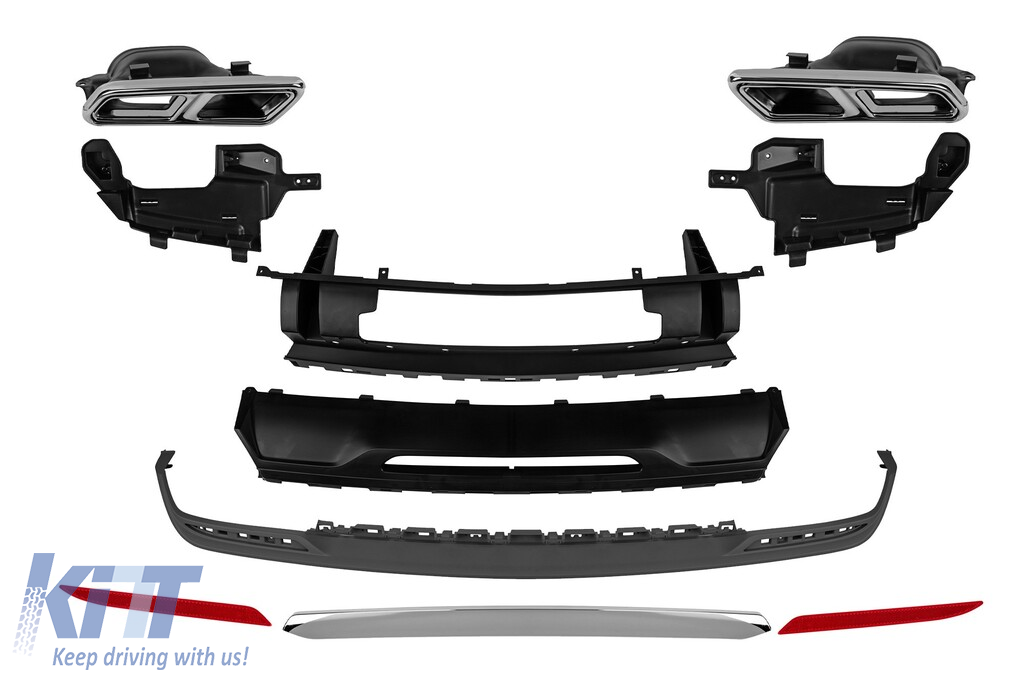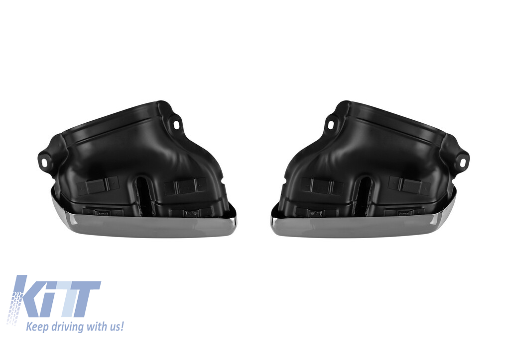 Diffuser with tips for rear AMG bumper type S65 suitable for Mercedes S-Class W222 after 2013 with two openings for dual exhaust, made from high-quality ABS plastic. The diffuser fits perfectly. It gives a unique and different look to the vehicle. The tuning diffuser features dual openings on the left and right sides. The openings are suitable for a dual exhaust tip, as shown in the graphic. A single oval exhaust tip can also be installed. This model of diffuser is designed for a tuning bumper. This is due to the specific shape of the tuning bumper compared to the standard bumper fitted by the vehicle manufacturer. The diffuser is made from elastic, impact-resistant, high-quality ABS plastic. Every corner and opening of the diffuser is carefully processed to avoid unpleasant sharp edges, thus achieving the perfect element for a 100% fit. Compatibility: