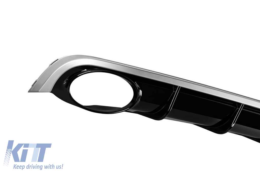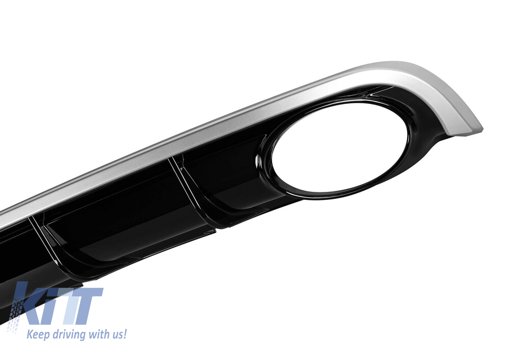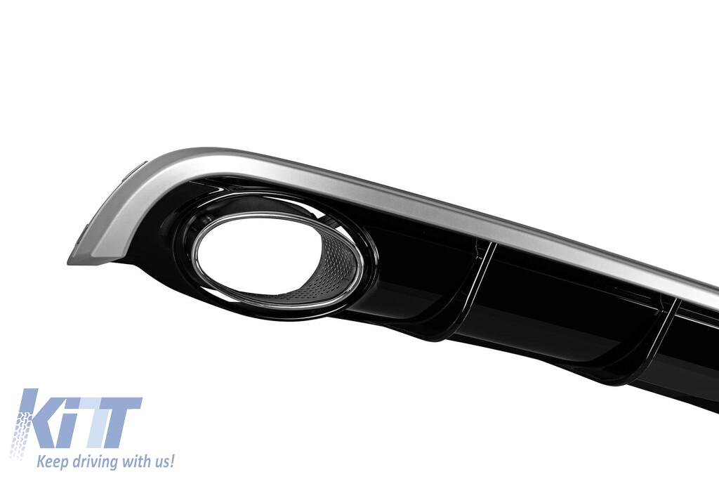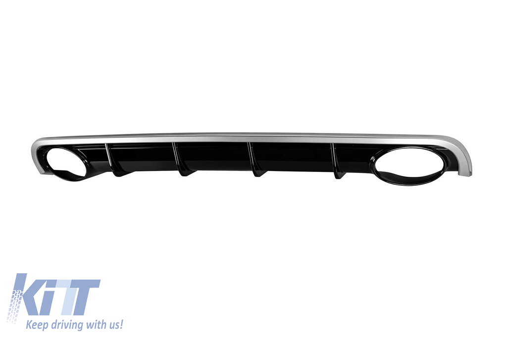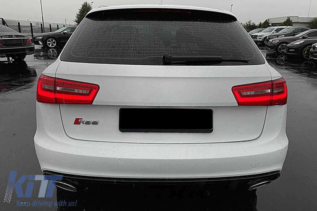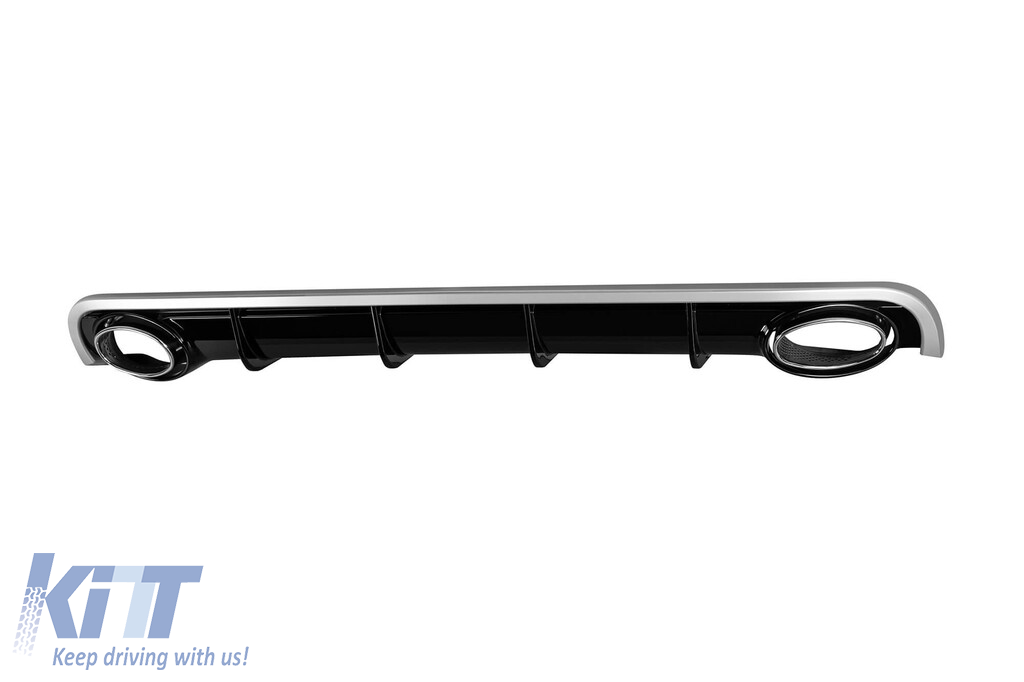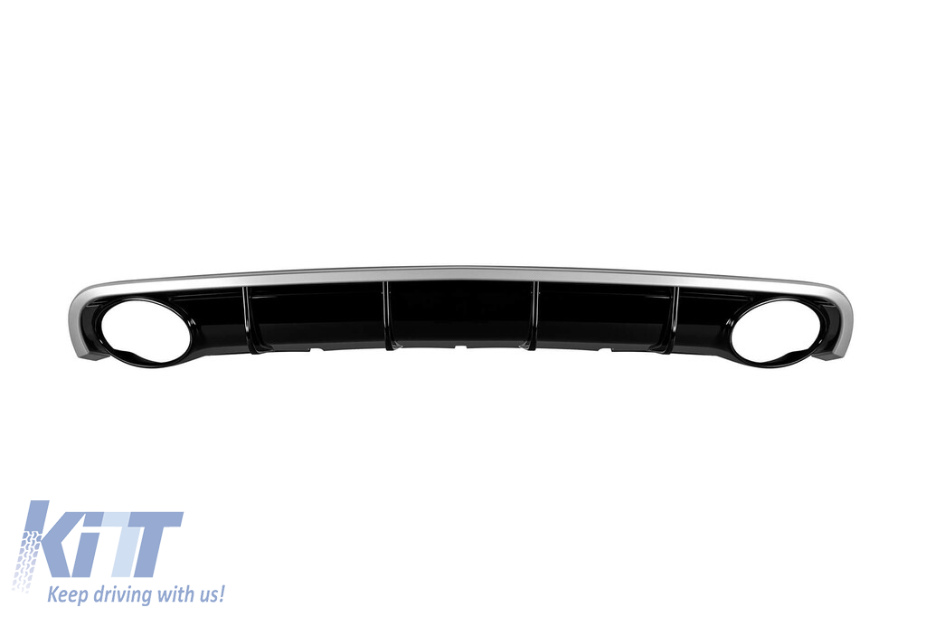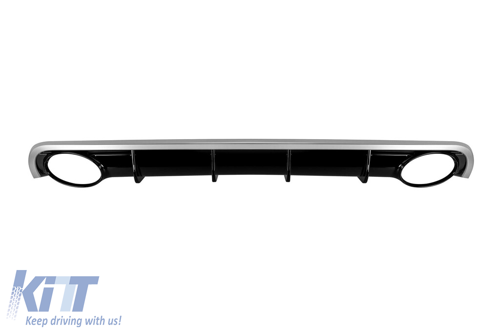 Diffuser with tips for standard rear bumper suitable for Audi A6 C7 2011-2015 with two single exhaust openings, made from high-quality ABS plastic. The diffuser fits perfectly. It gives a unique and different look to the vehicle. The tuning diffuser features dual openings on the left and right sides. The openings are suitable for a single exhaust tip, as indicated in the diagram. *The tips are attached to the diffuser using fasteners. This model of diffuser is designed for a standard bumper. This is due to the specific shape of the standard bumper installed by the vehicle manufacturer. The diffuser is made from flexible, impact-resistant, high-quality ABS plastic. Every corner and opening of the diffuser is carefully processed to avoid unpleasant sharp edges, thus achieving the perfect element for a 100% fit. Compatibility:
