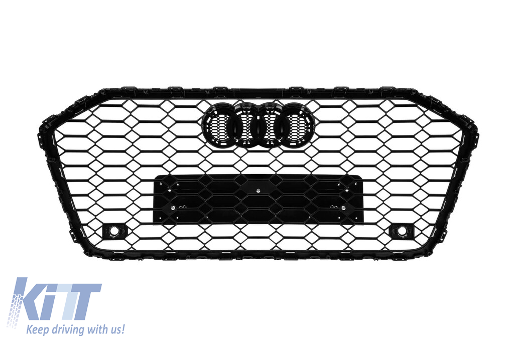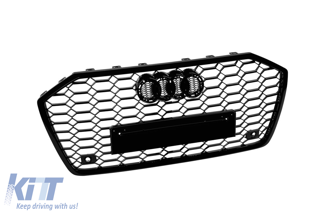 Black lacquer RS6 type grille suitable for Audi A6 after 2018 for models equipped with standard or S-line front bumper, with emblem base, with openings for parking sensors.