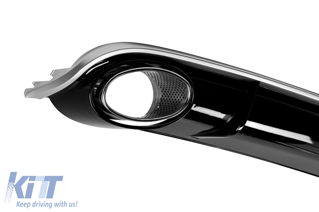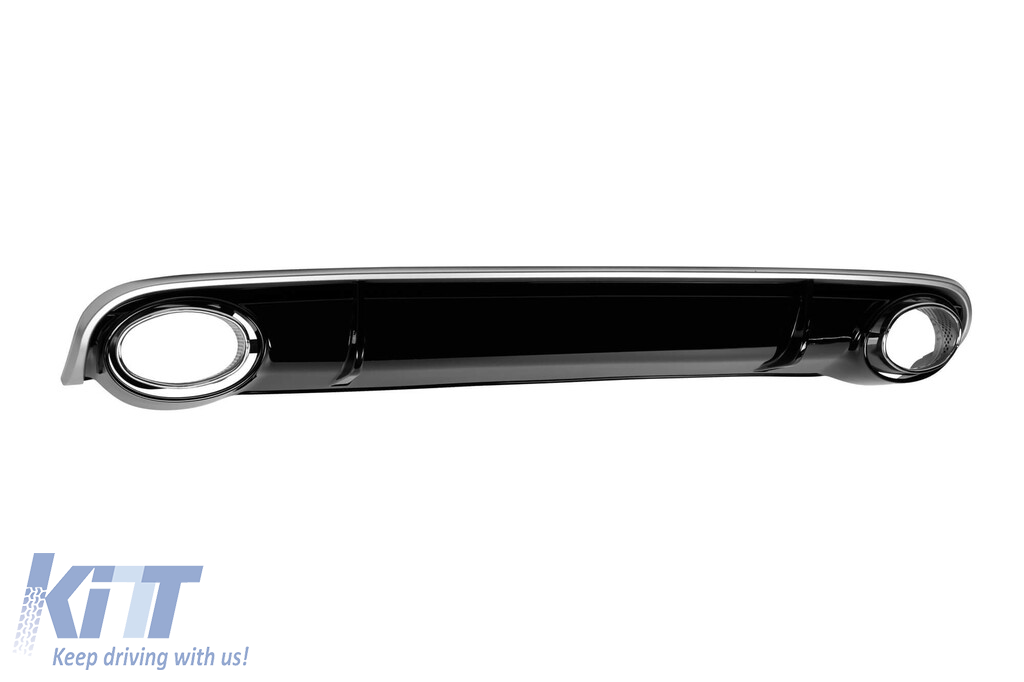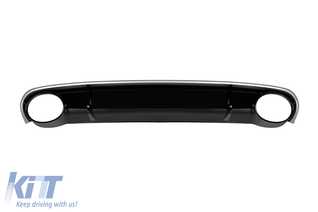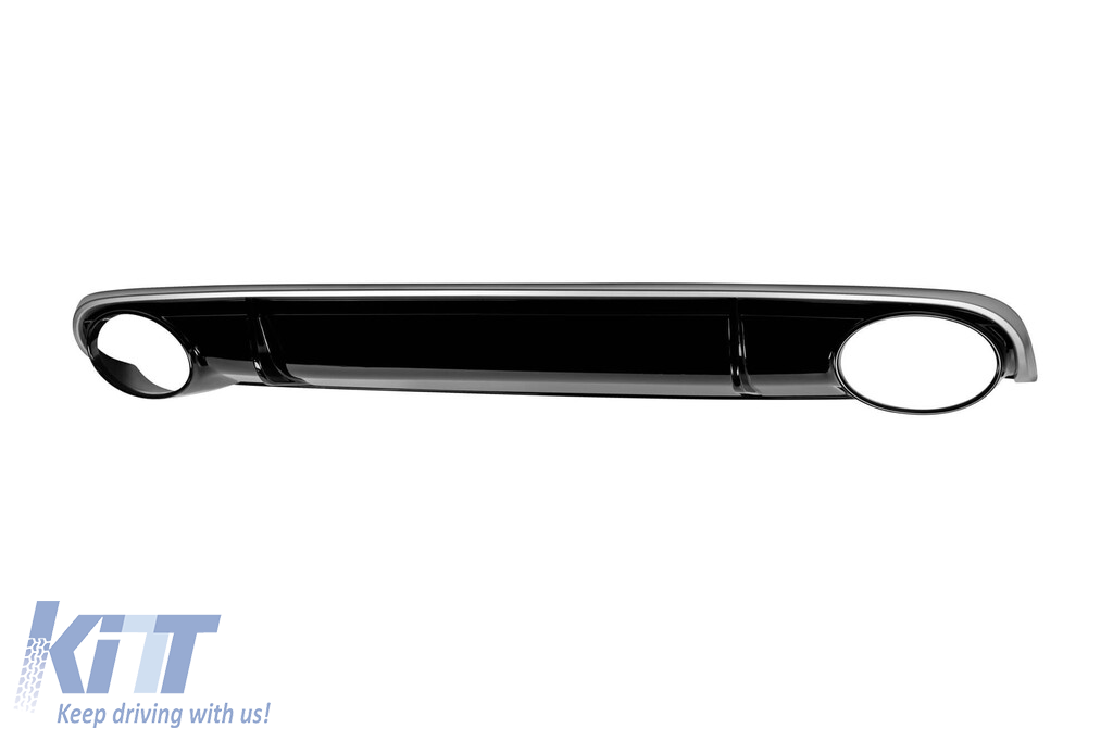 RS4 type diffuser suitable for standard rear bumper of Audi with two openings for single exhaust, made from high-quality ABS plastic. The diffuser fits perfectly. It gives a unique and different look to the vehicle. The tuning diffuser features single openings on the left and right sides. The openings are suitable for a dual exhaust tip, as indicated in the graphic. *The tips are attached to the diffuser using fasteners. This model of diffuser is designed for standard bumper. This is due to the specific shape of the standard bumper installed by the vehicle manufacturer. The diffuser is made from elastic, impact-resistant, high-quality ABS plastic. Every corner and opening of the diffuser is carefully processed to avoid unpleasant sharp edges, thus achieving the perfect element for a 100% fit.