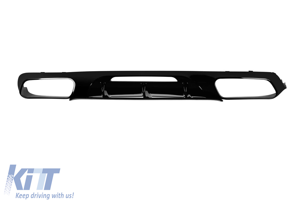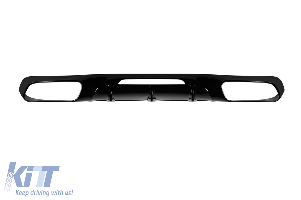 Rear diffuser suitable for tuning bumper, with dual openings for dual exhaust, made from high-quality ABS plastic. The diffuser fits perfectly. It gives a unique and different look to the vehicle. The tuning diffuser features dual openings on both the left and right sides. These openings are suitable for a dual exhaust tip, as shown in the graphic. A single oval exhaust tip can also be installed. This model of diffuser is designed for a tuning bumper. This is due to the specific shape of the tuning bumper compared to the standard bumper installed by the vehicle manufacturer. The diffuser is made from elastic, impact-resistant, high-quality ABS plastic. Every corner and opening of the diffuser is carefully processed to avoid unpleasant sharp edges, thus achieving the perfect element for a 100% fit.