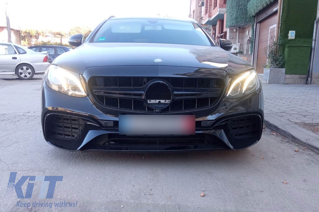 A Design package type E63 suitable for Mercedes E-Class W213 2016-2019 with black exhaust tips and black trim, for the model with standard rear bumper.