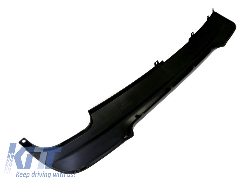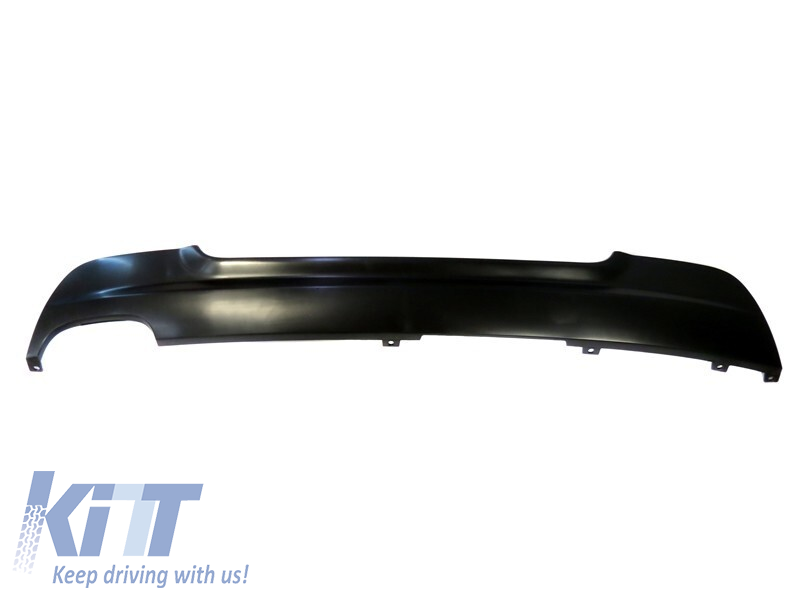 Diffuser suitable for rear M Technik bumper on BMW Series 3 with a single opening for a dual exhaust tip made from high-quality ABS plastic. The diffuser fits perfectly. It gives a unique and distinct look to the vehicle. The tuning diffuser features a single opening on the left side. This opening is suitable for a dual exhaust tip, as indicated in the graphic. A single oval exhaust tip can also be installed. This model of diffuser is designed for a tuning bumper. This is due to the specific shape of the tuning bumper compared to the standard bumper installed by the vehicle manufacturer. The diffuser is made from elastic, impact-resistant, high-quality ABS plastic. Every corner and opening of the diffuser is carefully processed to avoid unpleasant sharp edges, thus achieving the perfect element for a 100% fit.