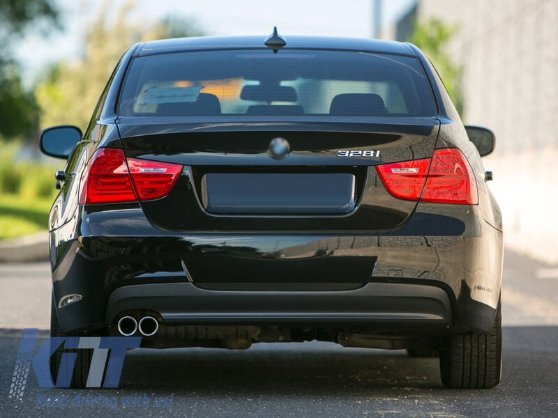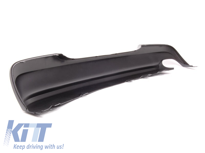 Rear diffuser suitable for BMW 3 Series E90/E91 2008-2011 with a single opening for dual exhaust sedan/wagon made from high-quality ABS plastic. The diffuser fits perfectly. It gives a unique and different look to the vehicle. The tuning diffuser features one opening on the left side. This opening is suitable for a dual exhaust tip, as indicated in the diagram. A single oval exhaust tip can also be installed. This model of diffuser is designed for a tuning bumper. This is due to the specific shape of the tuning bumper compared to the standard bumper installed by the vehicle manufacturer. The diffuser is made from flexible, impact-resistant, high-quality ABS plastic. Every corner and opening of the diffuser is carefully processed to avoid unpleasant sharp edges, achieving a perfect fit of 100%. Compatibility: