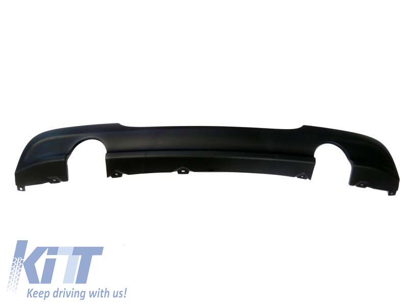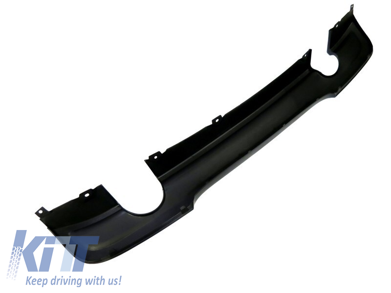 Rear diffuser suitable for M Technik rear bumper on BMW 3 Series E90/E91 2004-2008 with dual opening for single exhaust made from high-quality ABS plastic. The diffuser fits perfectly. It gives a unique and different look to the vehicle. The tuning diffuser features a single opening on both the left and right sides. This opening is suitable for a single exhaust tip, as shown in the graphic. An oval-shaped single exhaust tip can also be installed. This model of diffuser is designed for a tuning bumper. This is due to the specific shape of the tuning bumper compared to the standard bumper installed by the vehicle manufacturer. The diffuser is made from elastic, impact-resistant, high-quality ABS plastic. Every corner and opening of the diffuser is carefully processed to avoid unpleasant sharp edges, thus achieving the perfect element for a 100% fit.