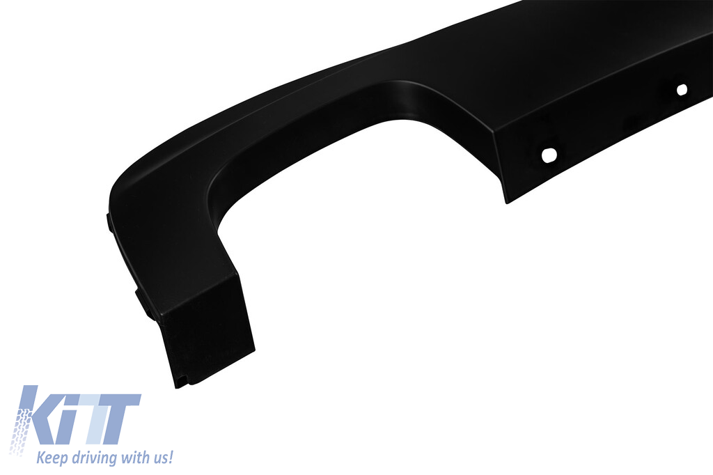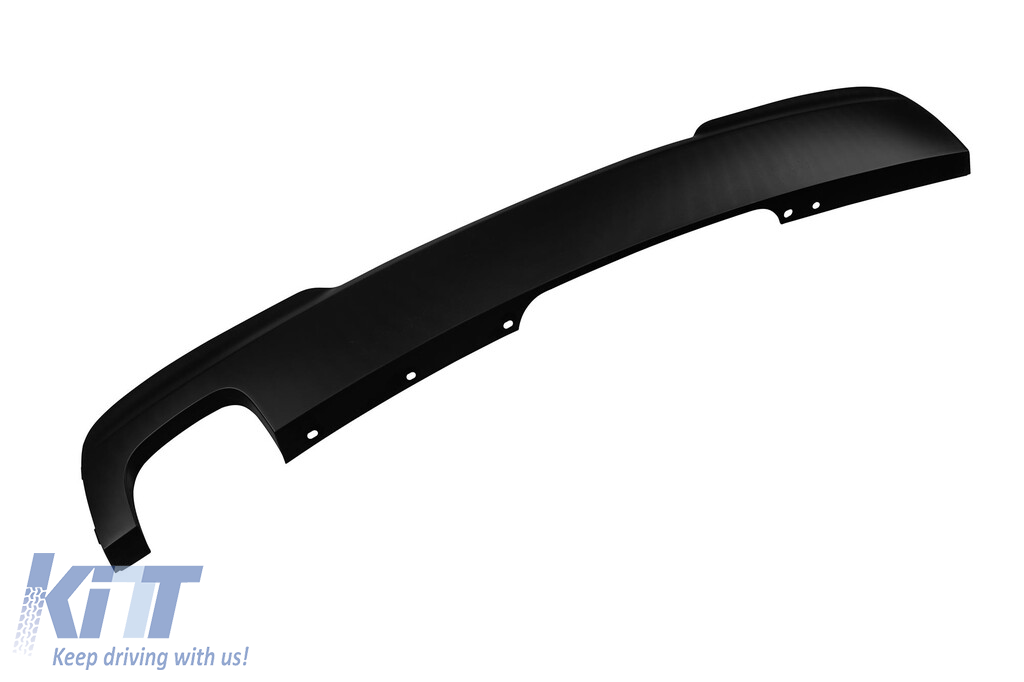 Rear diffuser suitable for M Technik rear bumper on BMW 5 Series F10/F11 2010-2017 with a single opening for dual exhaust sedan/wagon made from high-quality ABS plastic. The diffuser fits perfectly. It gives a unique and different look to the vehicle. The tuning diffuser features one opening on the left side. This opening is suitable for a dual exhaust tip, as shown in the graphic. A single oval exhaust tip can also be installed. This model of diffuser is designed for a tuning bumper. This is due to the specific shape of the tuning bumper compared to the standard bumper installed by the vehicle manufacturer. The diffuser is made from elastic, impact-resistant, high-quality ABS plastic. Every corner and opening of the diffuser is carefully processed to avoid unpleasant sharp edges, thus achieving the perfect element for a 100% fit.