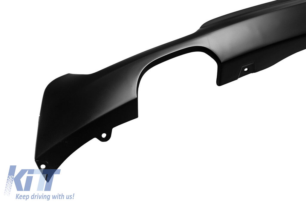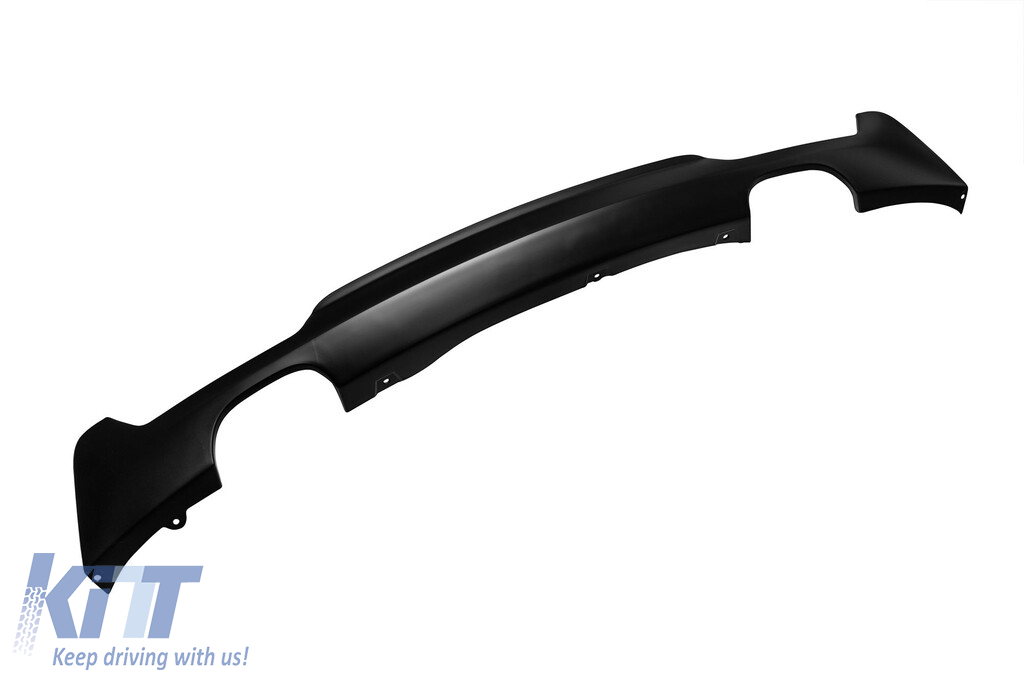 Rear diffuser suitable for BMW Series 4 F32/F33/F36 after 2013 with a single opening for dual exhaust sedan/wagon made from high-quality ABS plastic. The diffuser fits perfectly. It gives a unique and different look to the vehicle. The tuning diffuser features dual openings on the left and right sides. This opening is suitable for a dual exhaust tip, as shown in the graphic. It can also accommodate a single oval exhaust tip. This model of diffuser is designed for a tuning bumper. This is due to the specific shape of the tuning bumper compared to the standard bumper installed by the vehicle manufacturer. The diffuser is made from elastic, impact-resistant, high-quality ABS plastic. Every corner and opening of the diffuser is carefully processed to avoid unpleasant sharp edges, thus achieving the perfect element for a 100% fit. Compatibility: Suitable for BMW Series 4 F32 after 2013 with M Technik II and M rear bumpers. Suitable for BMW Series 4 F33 after 2013 with M Technik II and M rear bumpers. Suitable for BMW Series 4 F36 after 2013 with M Technik II and M rear bumpers. Not suitable for BMW Series 4 F32 after 2013 model with standard bumper. Not suitable for BMW Series 4 F33 after 2013 model with standard bumper. Not suitable for BMW Series 4 F36 after 2013 model with standard bumper. Technical Info: • Weight: 1.00 • Producer: AB • EAN: 0000124193 • Color: Matte Black • Type of diffuser: For tuning bumper • Type of exhaust vents: -o---o-, -oo-oo-