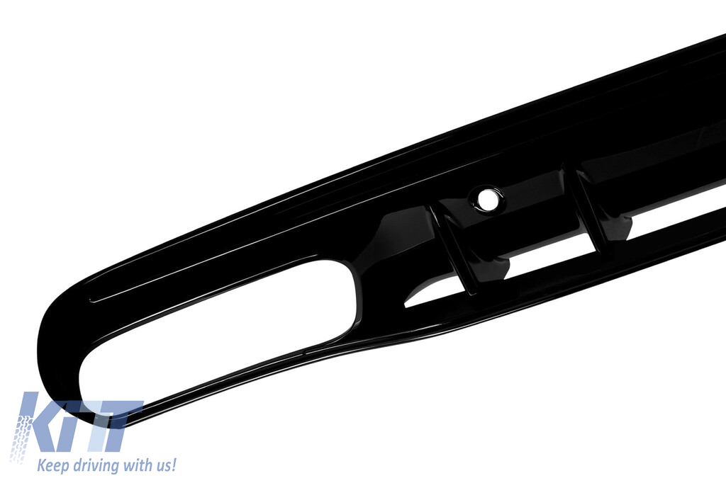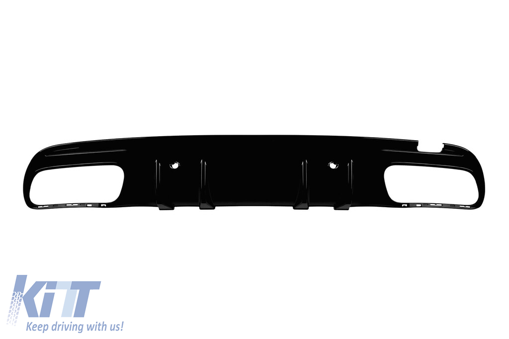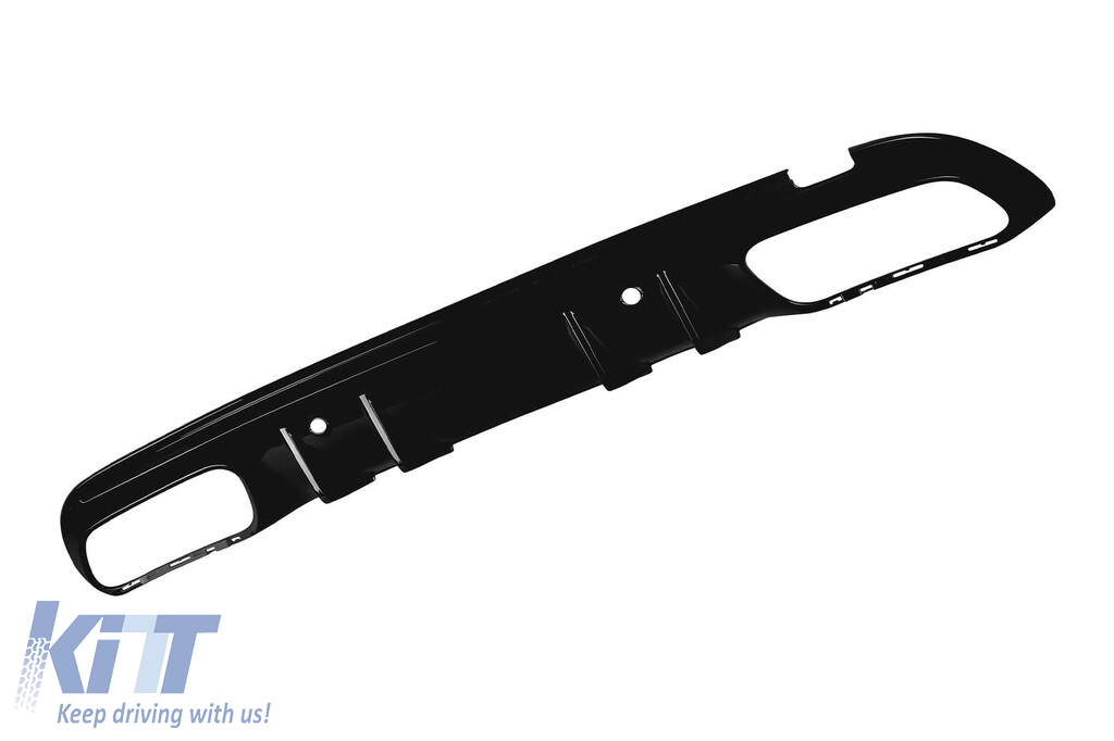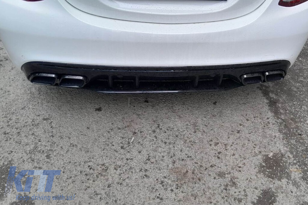 Diffuser with tips for rear A Design bumper suitable for Mercedes C-Class W205 2014-2020 with two openings for dual exhaust, made from high-quality ABS plastic. The diffuser fits perfectly. It gives a unique and different look to the vehicle. The tuning diffuser features dual openings on the left and right side. The openings are suitable for a dual exhaust tip, as indicated in the graphic. A single oval exhaust tip can also be installed. This model of diffuser is designed for a tuning bumper. This is due to the specific shape of the tuning bumper compared to the standard bumper installed by the vehicle manufacturer. The diffuser is made from elastic, impact-resistant, high-quality ABS plastic. Every corner and opening of the diffuser is carefully processed to avoid unpleasant sharp edges, thus achieving the perfect element for a 100% fit. SUITABILITY:
