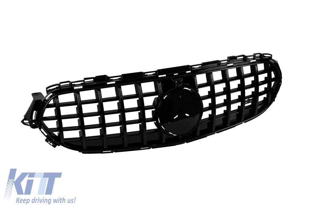 Black lacquer GT type grille suitable for Mercedes E-Class W213, S213 estate, C238 coupe, A238 convertible after 2020 with opening for camera for standard bumper