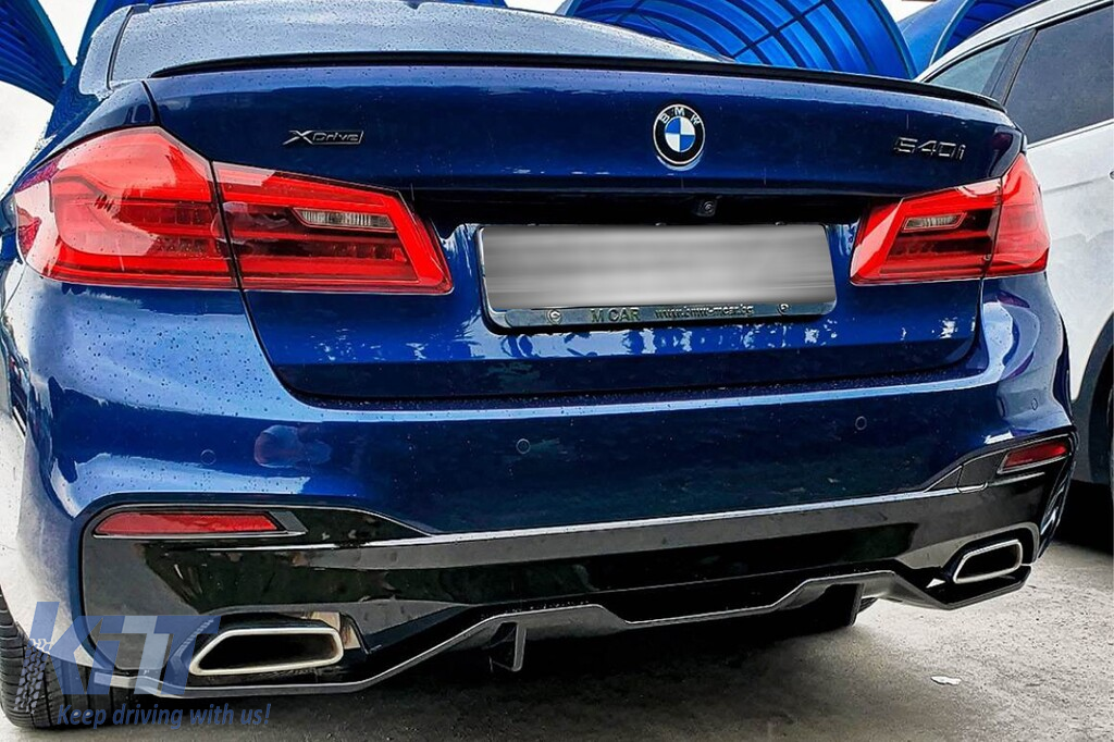 M Performance Design Design diffuser suitable for rear M Technik bumper BMW 5 Series with dual opening for dual exhaust sedan/wagon made from high-quality ABS plastic. The diffuser fits perfectly. It gives a unique and different look to the vehicle. The tuning diffuser features dual openings on the left and right sides. These openings are suitable for a dual exhaust tip, as indicated in the graphic. A single oval exhaust tip can also be installed. This model of diffuser is designed for tuning bumpers. This is due to the specific shape of the tuning bumper compared to the standard bumper installed by the vehicle manufacturer. The diffuser is made from elastic, impact-resistant, high-quality ABS plastic. Every corner and opening of the diffuser has been carefully processed to avoid unpleasant sharp edges, achieving a perfect fit element of 100%. Compatibility: Technical Info: • Weight: 3.00 • Producer: AB • EAN: 0000136420 • Color: Black lacquer • Type of diffuser: For tuning bumper • Type of exhaust vents: -oo-oo-, -oo-oo-