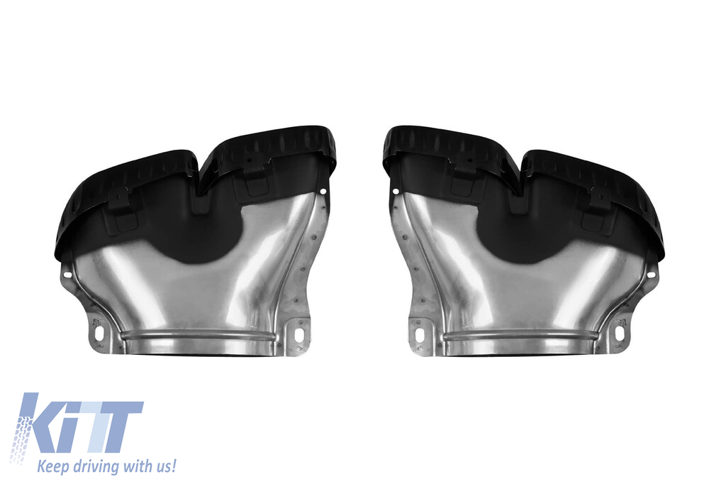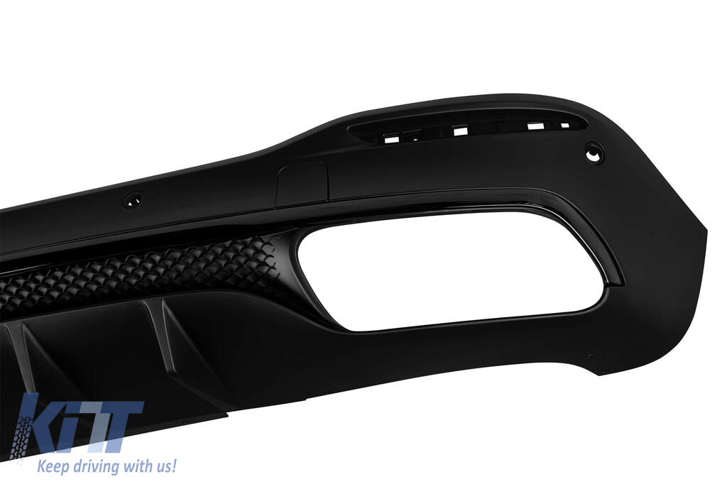 Rear diffuser suitable for tuning bumper, with dual openings for dual exhaust, made from high-quality ABS plastic. The diffuser fits perfectly. It gives a unique and different look to the vehicle. The tuning diffuser features dual openings on the left and right sides. These openings are suitable for a dual exhaust tip, as indicated in the graphic. A single oval exhaust tip can also be installed. This model of diffuser is designed for a tuning bumper. This is due to the specific shape of the tuning bumper compared to the standard bumper installed by the vehicle manufacturer. The diffuser is made from elastic, impact-resistant, high-quality ABS plastic. Every corner and opening of the diffuser is carefully processed to avoid unpleasant sharp edges, thus achieving the perfect element for a 100% fit.