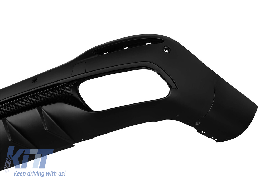Rear diffuser suitable for tuning bumper, with dual openings for dual exhaust, made from high-quality ABS plastic. The diffuser fits perfectly. It gives a unique and distinct look to the vehicle. The tuning diffuser features dual openings on the left and right sides. These openings are suitable for a dual exhaust tip, as shown in the graphic. It can also accommodate a single oval exhaust tip. This model of diffuser is designed for a tuning bumper. This is due to the specific shape of the tuning bumper compared to the standard bumper installed by the vehicle manufacturer. The diffuser is made from elastic, impact-resistant, high-quality ABS plastic. Every corner and opening of the diffuser has been carefully processed to avoid unpleasant sharp edges, thus achieving the perfect element for a 100% fit.