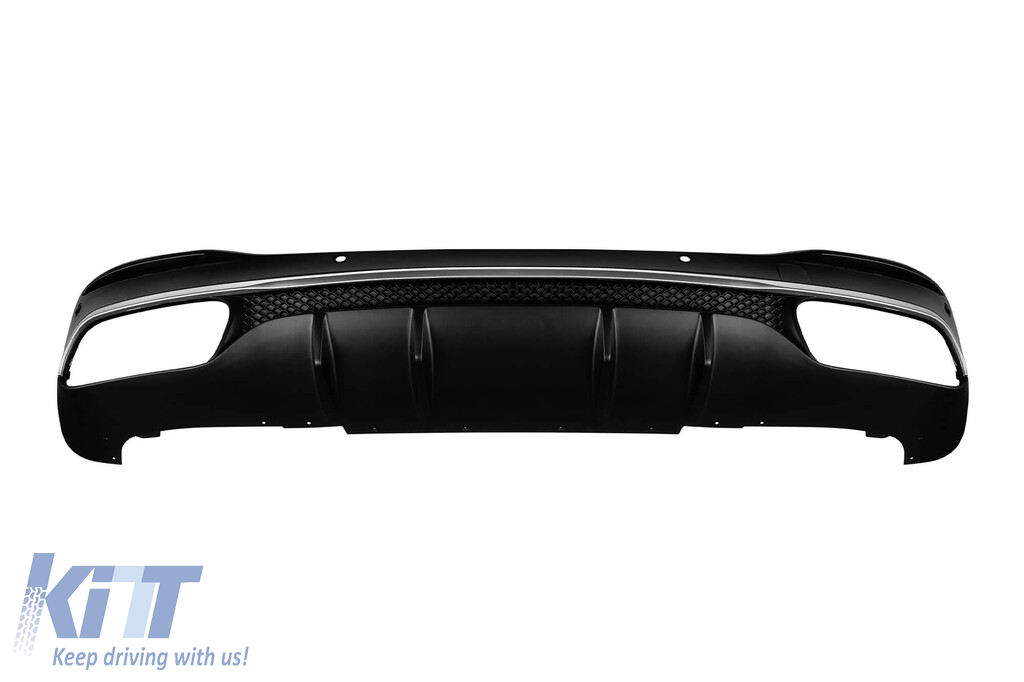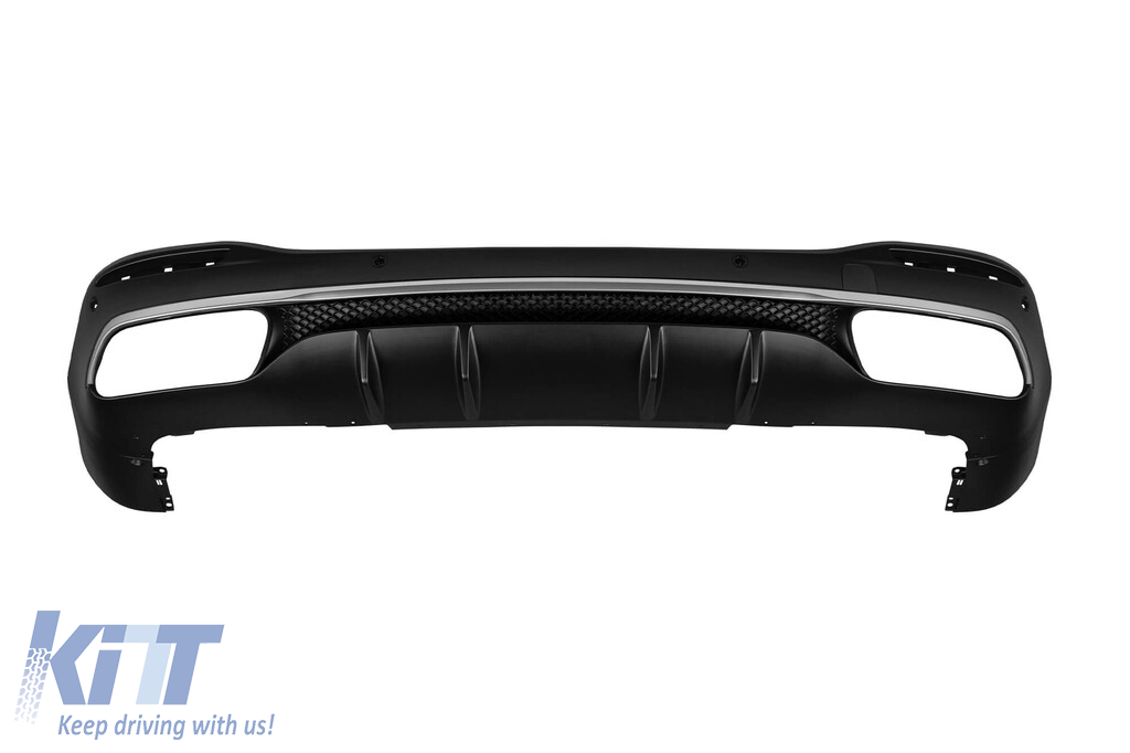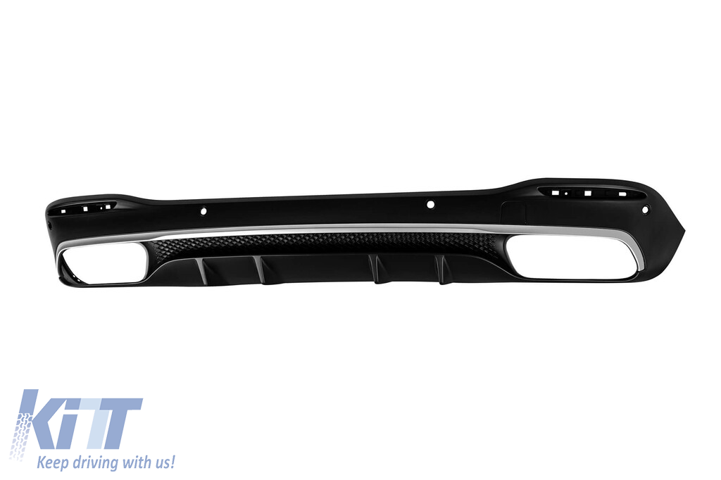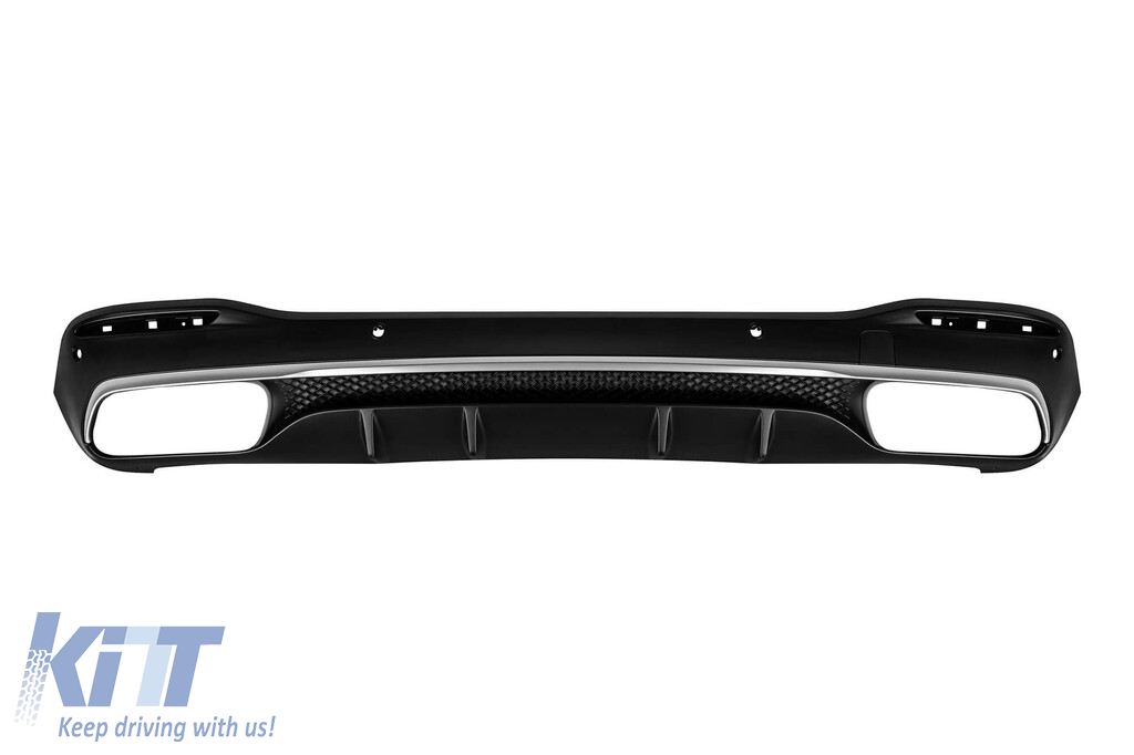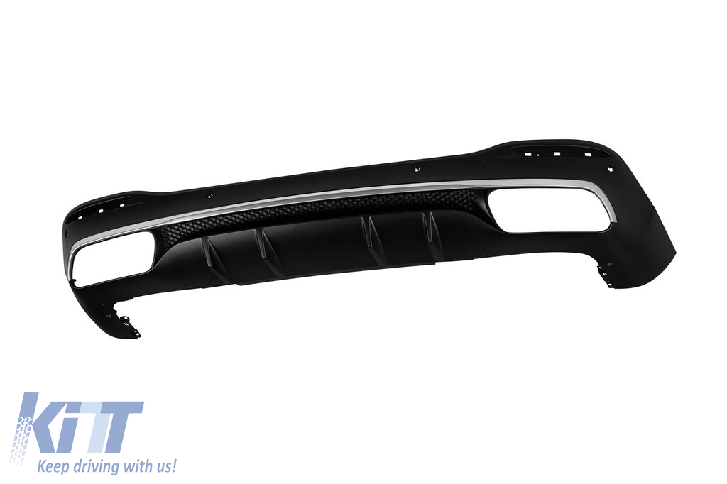 Rear diffuser suitable for tuning bumper, with dual openings for dual exhaust, made from high-quality ABS plastic. The diffuser fits perfectly. It gives a unique and different look to the vehicle. The tuning diffuser features dual openings on the left and right sides. These openings are suitable for a dual exhaust tip, as shown in the graphic. A single oval exhaust tip can also be installed. This model of diffuser is designed for tuning bumpers. This is due to the specific shape of the tuning bumper compared to the standard bumper installed by the vehicle manufacturer. The diffuser is made from elastic, impact-resistant, high-quality ABS plastic. Every corner and opening of the diffuser is carefully processed to avoid unpleasant sharp edges, achieving a perfect fit element of 100%. Technical Info: ⢠Weight: 7.00 ⢠Producer: AB ⢠EAN: 1000002664 ⢠Color: Matte black with chrome trim ⢠Type of diffuser: For tuning bumper ⢠Type of exhaust vents: -oo-oo-, -oo-oo-