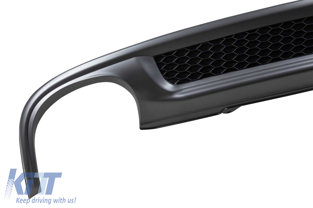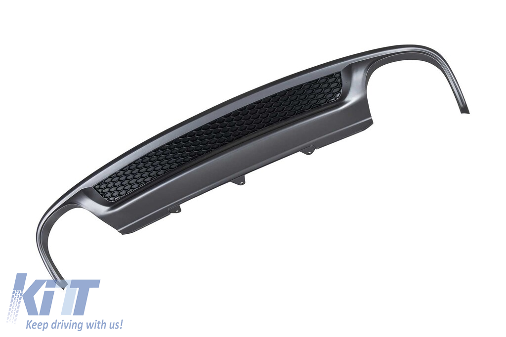 Diffuser with tips for standard rear bumper suitable for Audi A4 B8 2012-2015 with two openings for dual exhaust, made from high-quality ABS plastic. The diffuser fits perfectly. It gives a unique and distinct look to the vehicle. The tuning diffuser features dual openings on the left and right sides. The openings are suitable for a dual exhaust tip, as indicated in the graphic. *The tips are attached to the diffuser using fasteners. This model of diffuser is designed for a standard bumper. This is due to the specific shape of the standard bumper installed by the vehicle manufacturer. The diffuser is made from elastic, impact-resistant, high-quality ABS plastic. Every corner and opening of the diffuser is carefully processed to avoid unpleasant sharp edges, thus achieving the perfect element for a 100% fit. Compatibility: