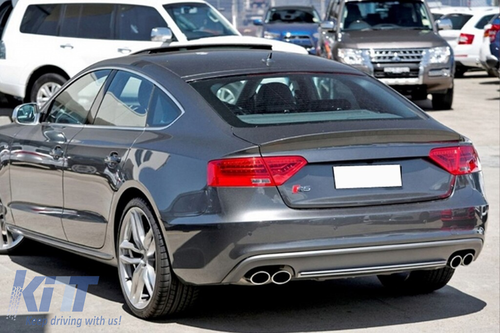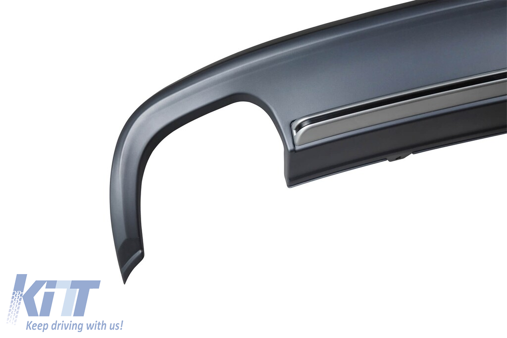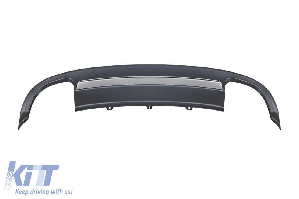 S5 type diffuser suitable for standard rear bumper of Audi A5 2012-2015 with two openings for dual exhaust, made from high-quality ABS plastic. The diffuser fits perfectly. It gives a unique and distinct look to the vehicle. The tuning diffuser features dual openings on the left and right sides. The openings are suitable for a dual exhaust tip, as indicated in the graphic. *The tips are attached to the diffuser using fasteners. This model diffuser is designed for a standard bumper. This is due to the specific shape of the standard bumper installed by the vehicle manufacturer. The diffuser is made from elastic, impact-resistant, high-quality ABS plastic. Every corner and opening of the diffuser is carefully processed to avoid unpleasant sharp edges, thus achieving the perfect element for a 100% fit. Compatibility: