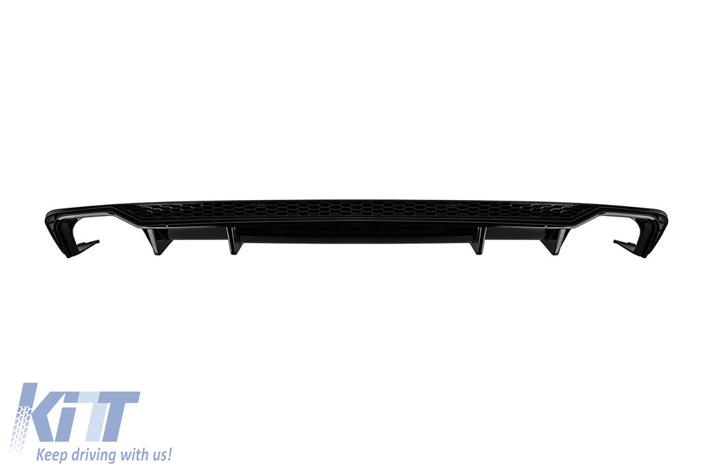 Rear diffuser suitable for tuning bumper, with dual openings for dual exhaust, made from high-quality ABS plastic. The diffuser fits perfectly. It gives a unique and different look to the vehicle. The tuning diffuser features dual openings on the left and right sides. These openings are suitable for a dual exhaust tip, as indicated in the graphic. A single oval exhaust tip can also be installed. This model of diffuser is designed for a tuning bumper. This is due to the specific shape of the tuning bumper compared to the standard bumper installed by the vehicle manufacturer. The diffuser is made from elastic, impact-resistant, high-quality ABS plastic. Every corner and opening of the diffuser has been carefully processed to avoid unpleasant sharp edges, achieving a perfect fit element of 100%. Technical Info: • Weight: 5.00 • Producer: AB • EAN: 1000002964 • Color: Black lacquer • Type of diffuser: For tuning bumper • Type of exhaust vents: -oo----, -oo-oo-