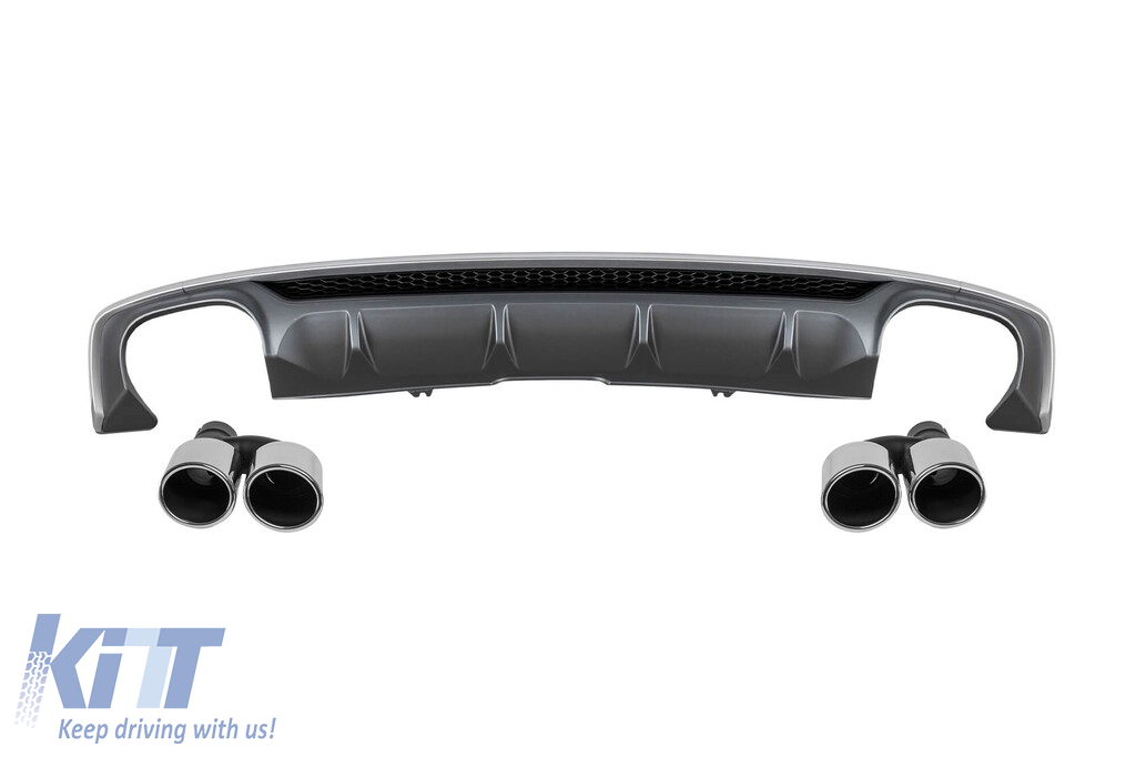 Rear diffuser suitable for tuning bumper, with dual openings for dual exhaust, made from high-quality ABS plastic. The diffuser fits perfectly. It gives a unique and different look to the vehicle. The tuning diffuser features dual openings on the left and right sides. These openings are suitable for a dual exhaust tip, as indicated in the graphic. A single oval exhaust tip can also be installed. This model of diffuser is designed for a tuning bumper. This is due to the specific shape of the tuning bumper compared to the standard bumper installed by the vehicle manufacturer. The diffuser is made from elastic, impact-resistant, high-quality ABS plastic. Every corner and opening of the diffuser is carefully processed to avoid unpleasant sharp edges, achieving a perfect fit element of 100%. Technical Info: • Weight: 5.00 • Producer: AB • EAN: 1000002965 • Color: Matte gray with gray lacquer trim • Type of diffuser: For tuning bumper • Type of exhaust vents: -oo-oo-, -oo-oo-