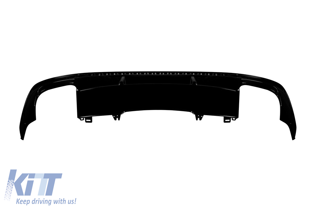 Rear diffuser suitable for S line bumper with two openings for dual exhaust, made from high-quality ABS plastic. The diffuser fits perfectly. It gives a unique and distinct look to the vehicle. The tuning diffuser features dual openings on the left and right sides. The openings are suitable for a dual exhaust tip, as indicated in the graphic. A single oval exhaust tip can also be installed. This model of diffuser is designed for a tuning bumper. This is due to the specific shape of the tuning bumper compared to the standard bumper installed by the vehicle manufacturer. The diffuser is made from elastic, impact-resistant, high-quality ABS plastic. Every corner and opening of the diffuser is carefully processed to avoid unpleasant sharp edges, thus achieving the perfect element for a 100% fit.