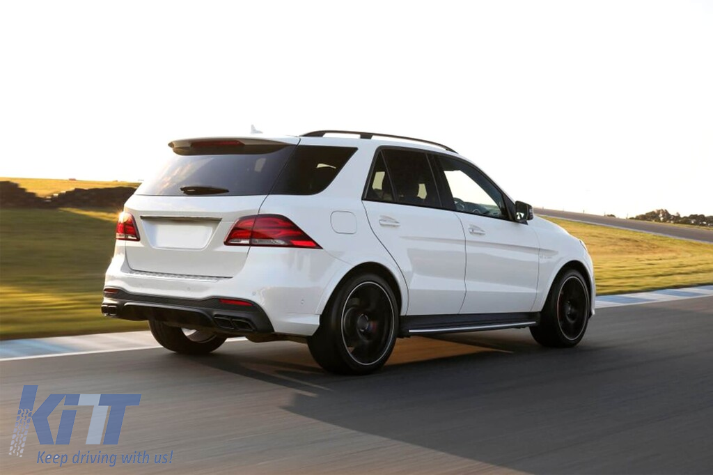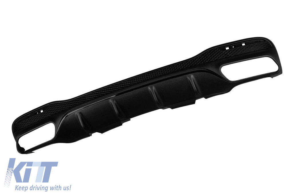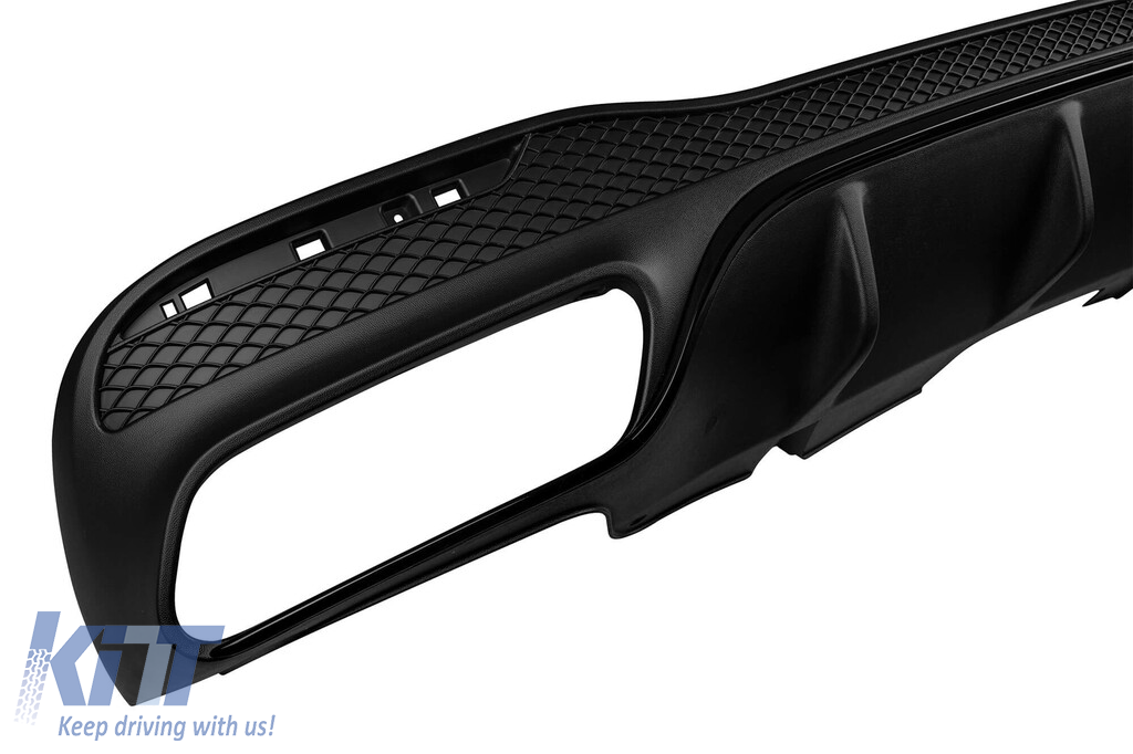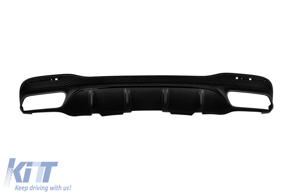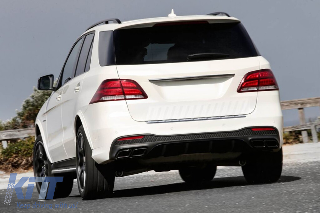 GLE63 type diffuser with black tips for rear A Design bumper suitable for Mercedes GLE SUV W166 with two dual exhaust openings, made from high-quality ABS plastic. The diffuser fits perfectly. It gives a unique and different look to the vehicle. The tuning diffuser features a dual opening on both the left and right sides. This opening is suitable for a single exhaust tip, as indicated in the graphic. It can also accommodate a single oval-shaped tip. This model of diffuser is designed for a tuning bumper. This is due to the specific shape of the tuning compared to the standard bumper installed by the vehicle manufacturer. The diffuser is made from elastic, impact-resistant, high-quality ABS plastic. Every corner and opening of the diffuser is carefully processed to avoid unpleasant sharp edges, achieving a perfect fit element of 100%. Compatibility: