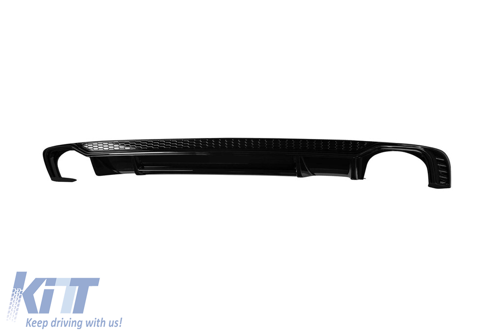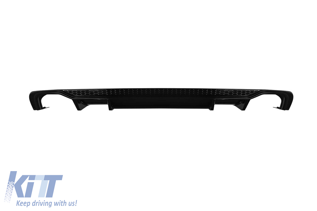 Rear diffuser suitable for S-line rear bumper on Audi A4 2015-2019 with exhaust openings on the left and right. The tuning diffuser is made from high-quality ABS plastic. The fit is perfect. It gives a unique and distinct look to the vehicle. The tuning diffuser features single openings on both the left and right sides. These openings are suitable for a dual exhaust tip, as indicated in the diagram. A single oval exhaust tip can also be installed. This model of diffuser is designed for a tuning bumper. This is due to the specific shape of the tuning bumper compared to the standard bumper installed by the vehicle manufacturer. The diffuser is made from elastic, impact-resistant, high-quality ABS plastic. Every corner and opening of the diffuser has been carefully processed to avoid unpleasant sharp edges, thus achieving the perfect element for a 100% fit.