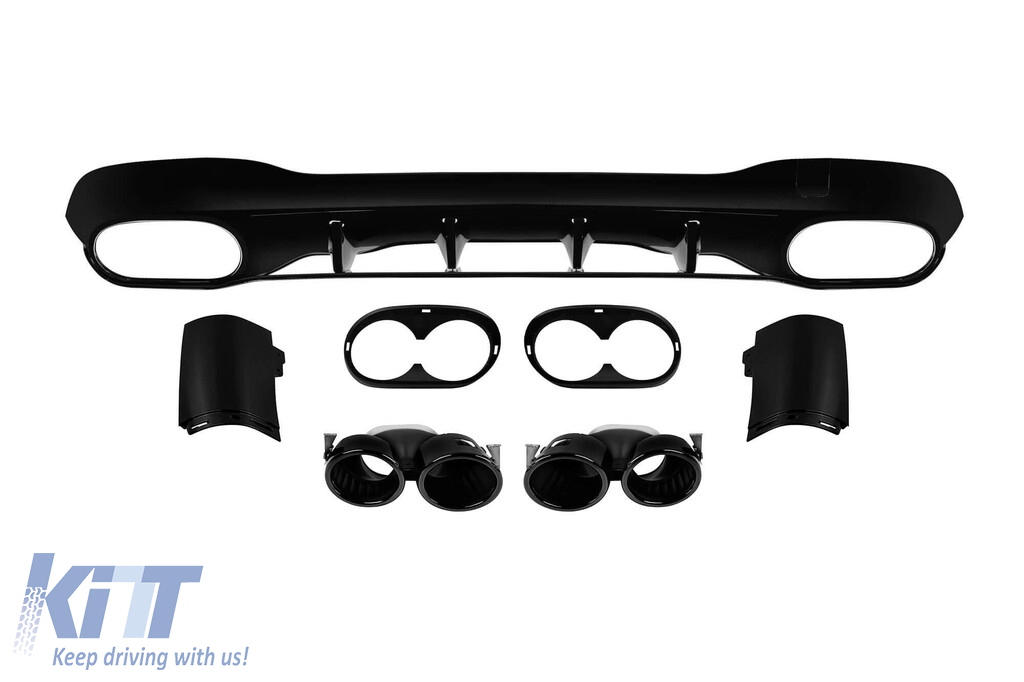 Rear diffuser suitable for tuning bumper, with dual openings for dual exhaust, made from high-quality ABS plastic. The diffuser fits perfectly. It gives a unique and different look to the vehicle. THE TUNING DIFFUSER IS NOT SUITABLE FOR MODELS EQUIPPED WITH A TOW BAR! The tuning diffuser features dual openings on the left and right sides. These openings are suitable for a dual exhaust tip, as shown in the diagram. A single oval exhaust tip can also be installed. This model of diffuser is designed for a tuning bumper. This is due to the specific shape of the tuning bumper compared to the standard bumper fitted by the vehicle manufacturer. The diffuser is made from elastic, impact-resistant, high-quality ABS plastic. Every corner and opening of the diffuser is carefully processed to avoid unpleasant sharp edges, achieving a perfect fit element of 100%. Technical Info: • Weight: 5.00 • Producer: AB • EAN: 1000014651 • Color: Black lacquer • Type of diffuser: For tuning bumper • Type of exhaust vents: -oo-oo-, -oo-oo-